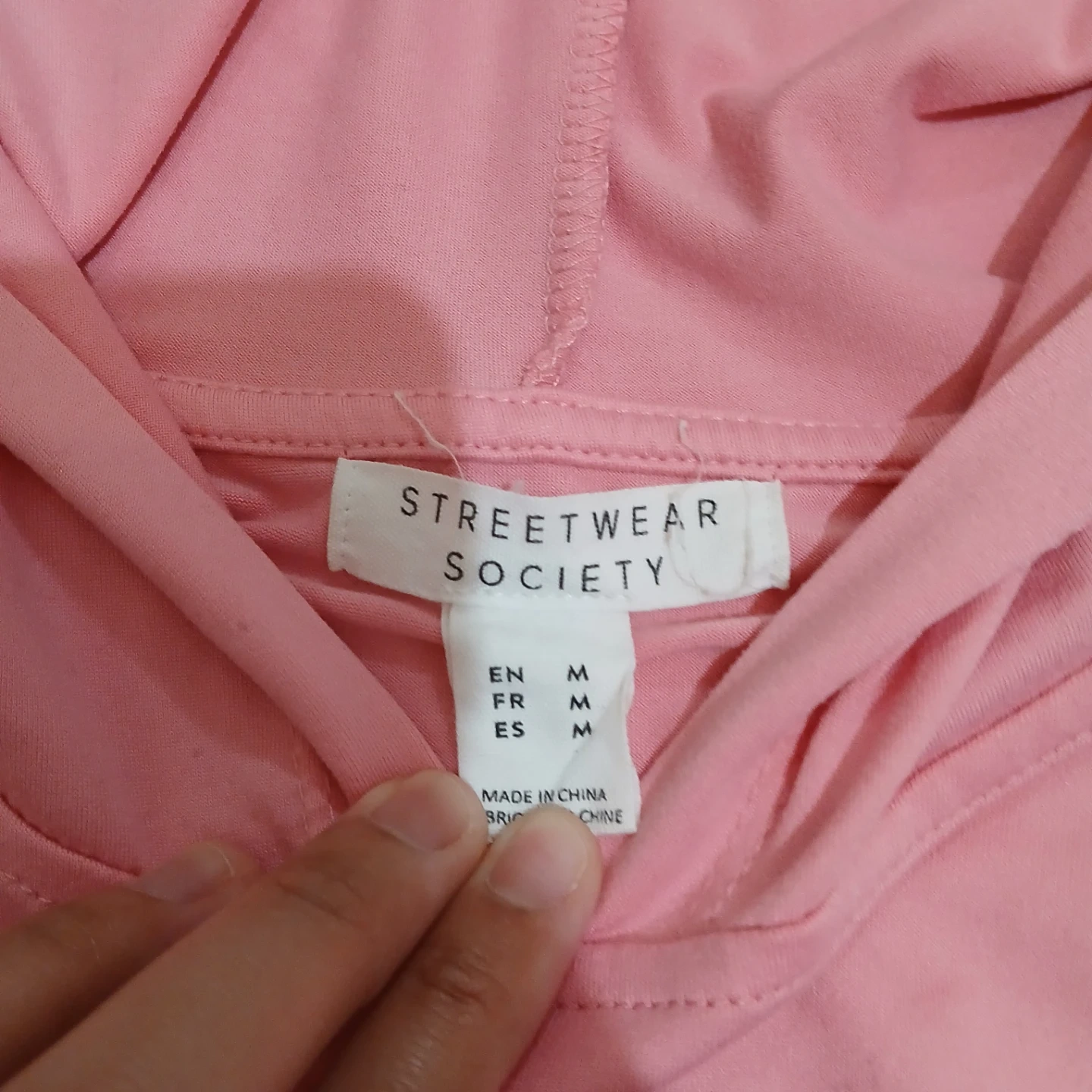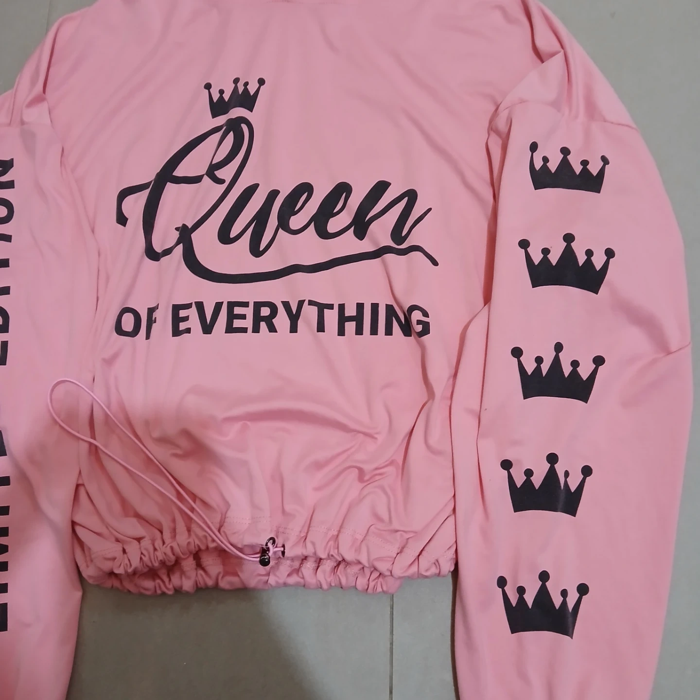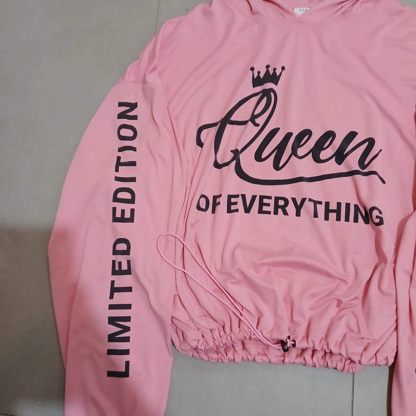 This pink hoodie from Streetwear Society features the "Queen of Everything" graphic and "Limited Edition" on the sleeves. It's a size medium with adjustable drawstrings at the hem.