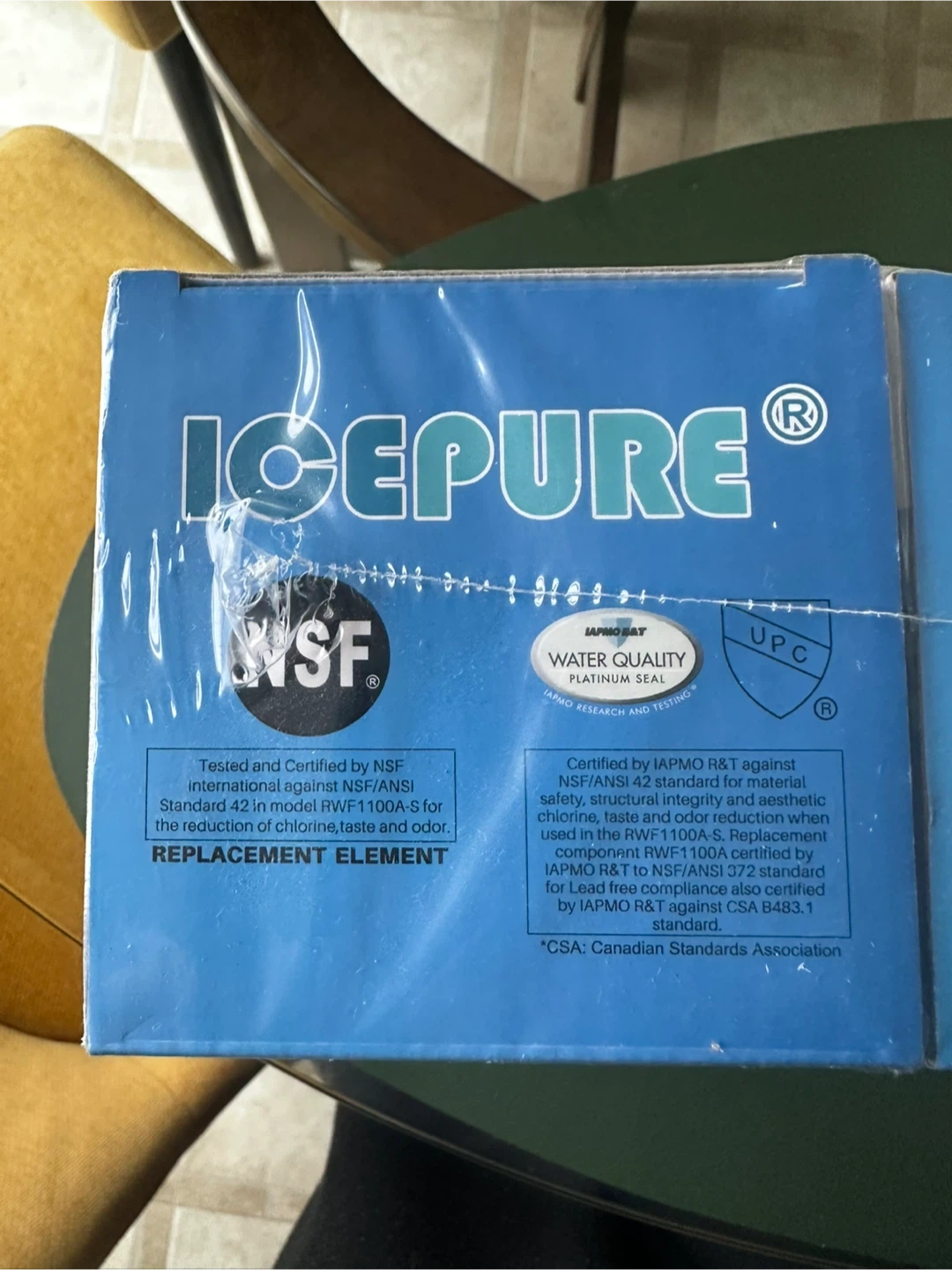 This is an ICEPURE Refrigerator Water Filter, model RWF1100A. It's certified by NSF/ANSI 42 for material safety, structural integrity, and aesthetic chlorine, taste, and odor reduction. Tested at a flow rate of 0.5gpm, it has a capacity of 300 gallons.