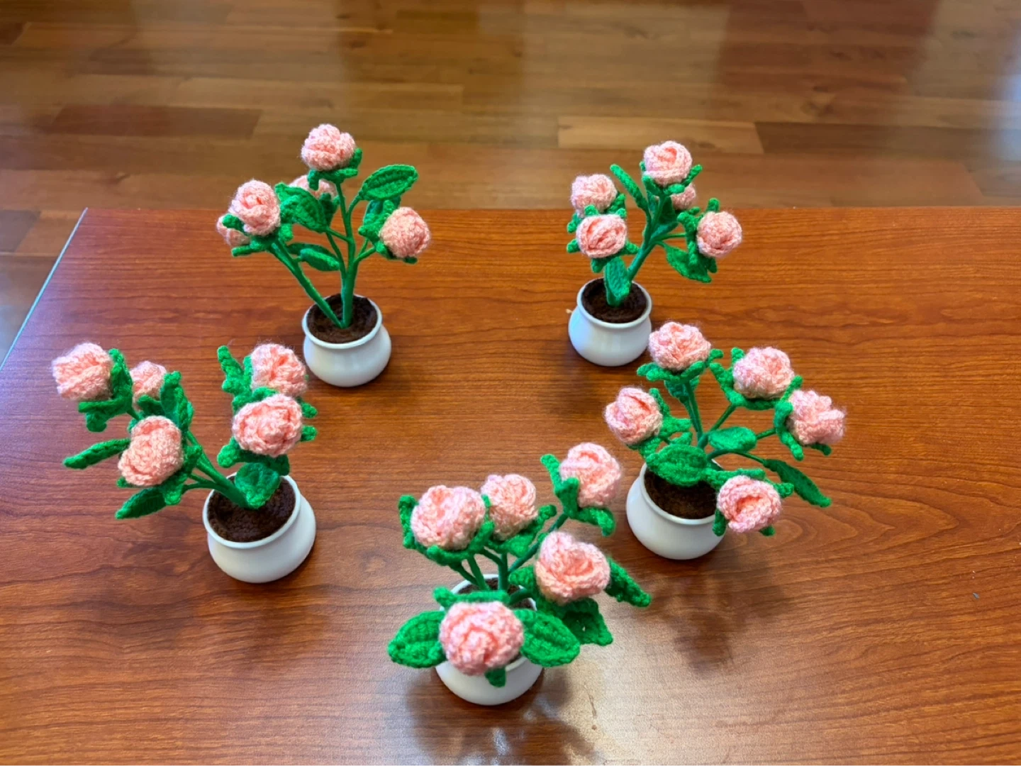 Hand-crocheted pink roses with green leaves in small white pots. These decorative pieces add a touch of charm to any space. Great for desks or shelves!