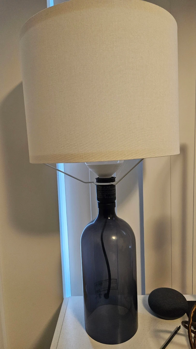 This table lamp features a grey glass bottle base and a neutral fabric shade. It uses a standard socket for the lightbulb. It's a stylish accent piece for any room. Measures approximately 18 inches tall.