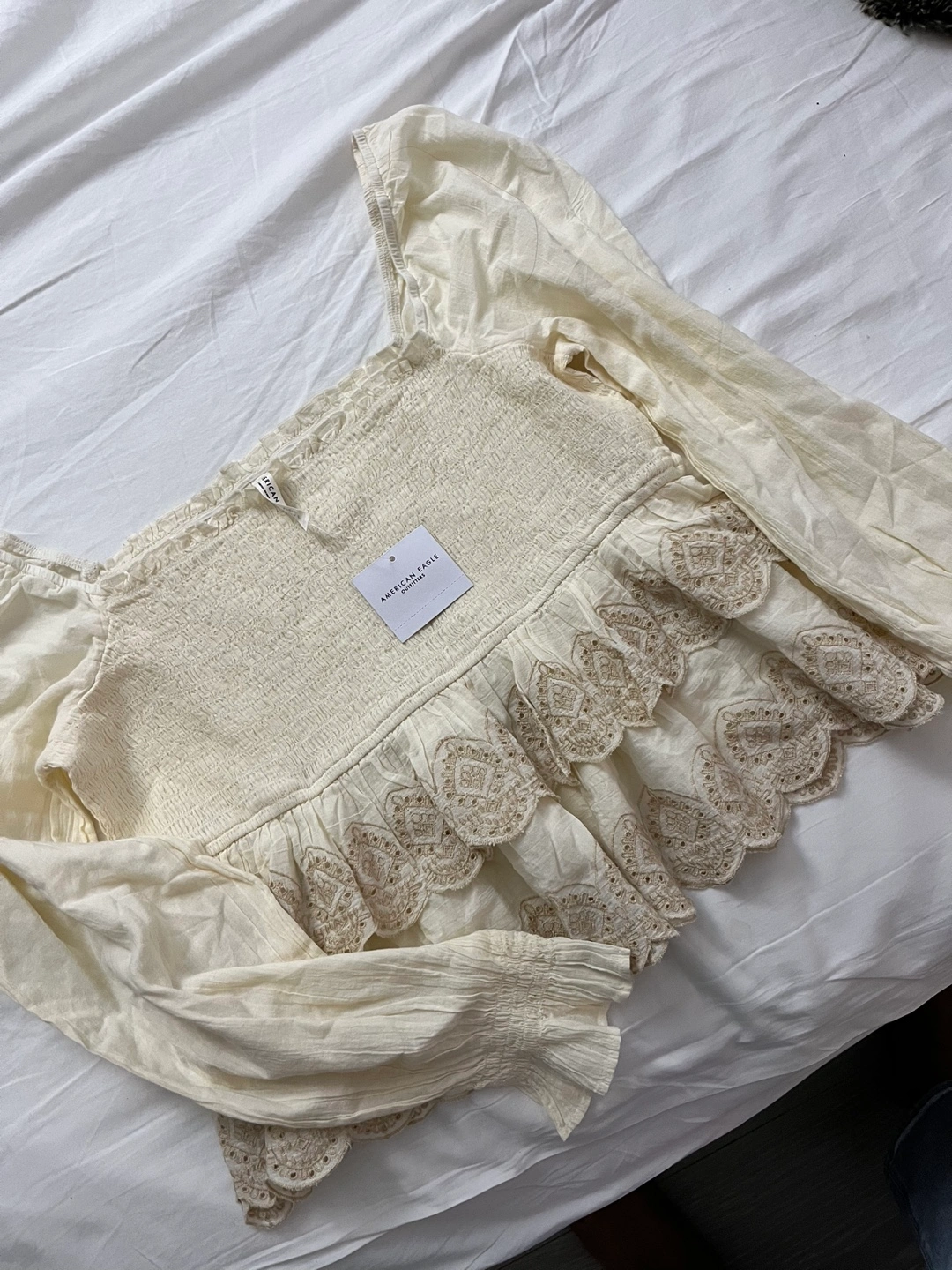 Cream-coloured long-sleeve smocked top. Features a square neckline, tiered ruffle bottom, and delicate embroidery. Long sleeves and a fitted bodice. Excellent condition.