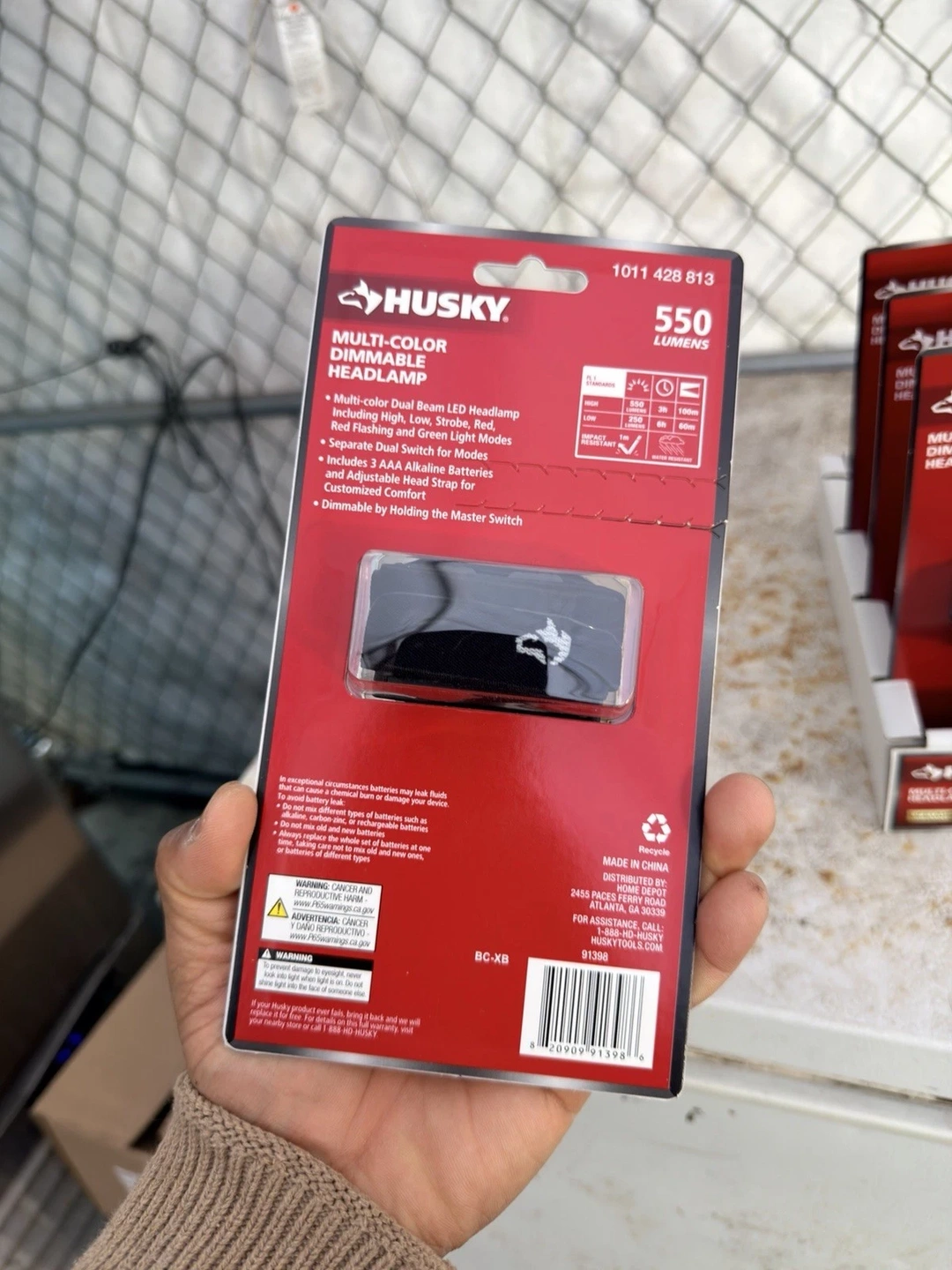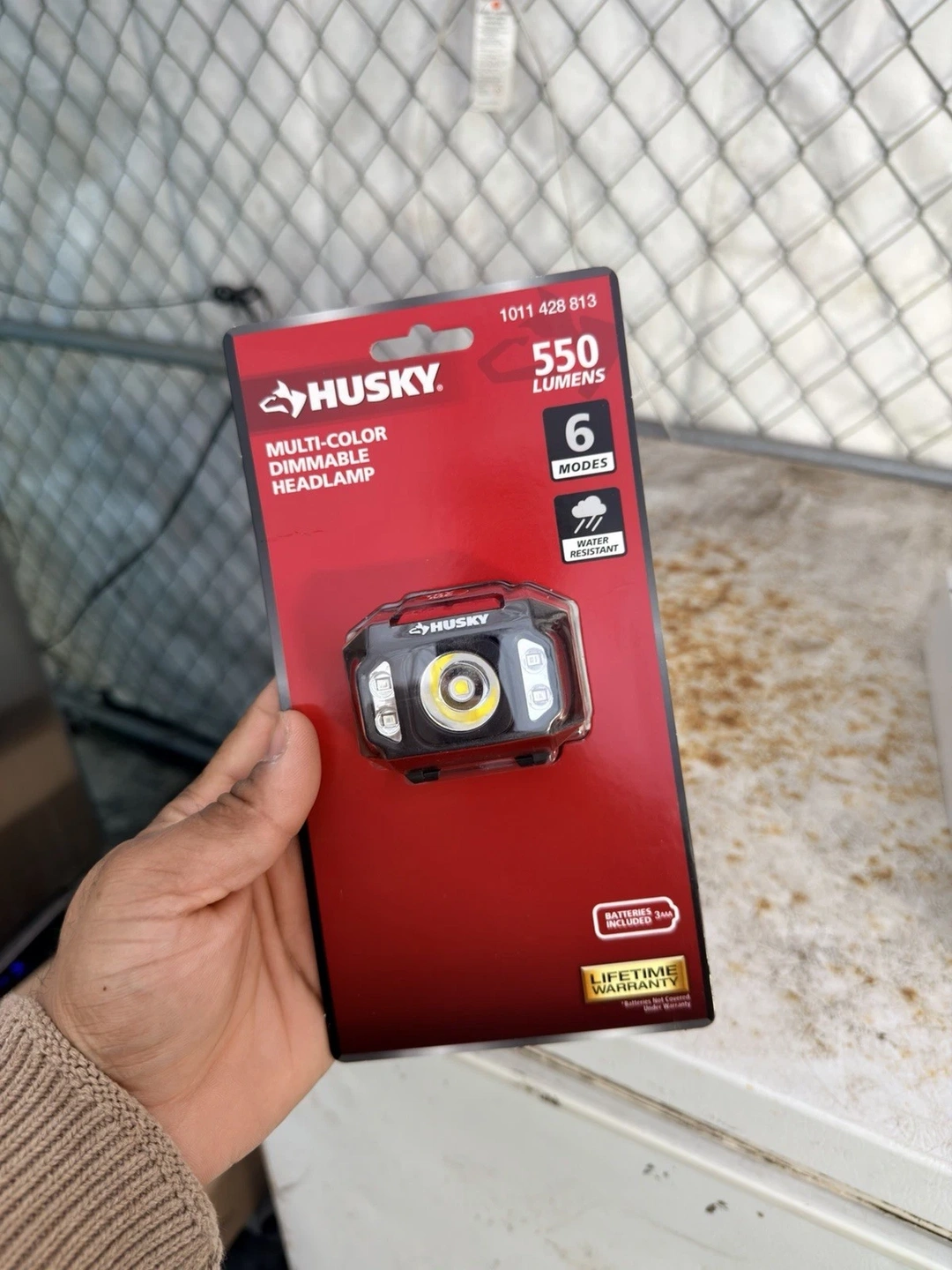 This is a new Husky LED headlamp. It's battery-powered using 3 AAA batteries and offers 550 lumens with a 250m operating range. Features include water resistance (IPX4), dimmable settings, multi-color light options, and an adjustable head strap. Comes with batteries included. Color: Black, Red. Model: Husky 1011 428 813. Let me know if you're interested!