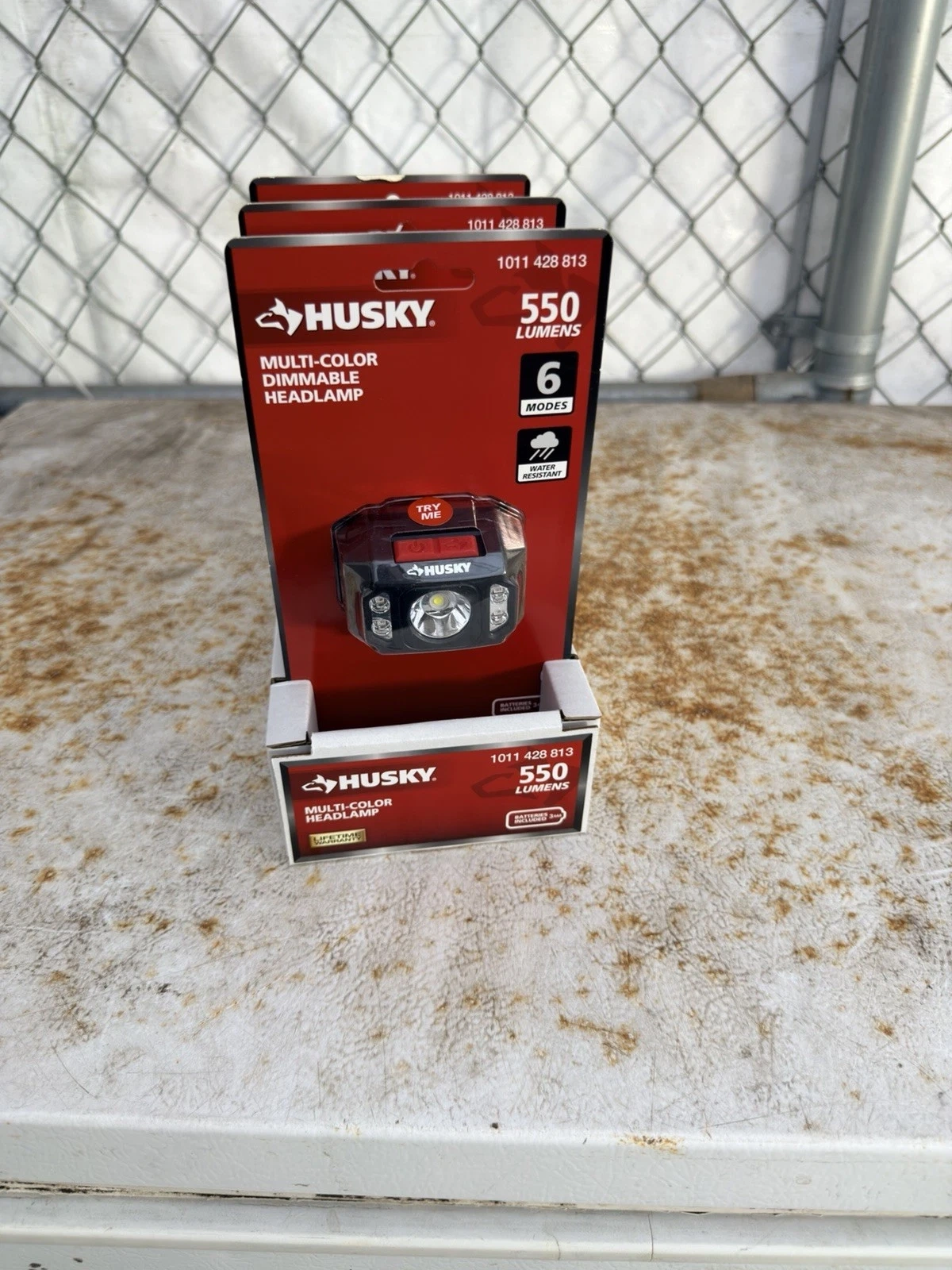 This is a new Husky LED headlamp. It's battery-powered using 3 AAA batteries and offers 550 lumens with a 250m operating range. Features include water resistance (IPX4), dimmable settings, multi-color light options, and an adjustable head strap. Comes with batteries included. Color: Black, Red. Model: Husky 1011 428 813. Let me know if you're interested!