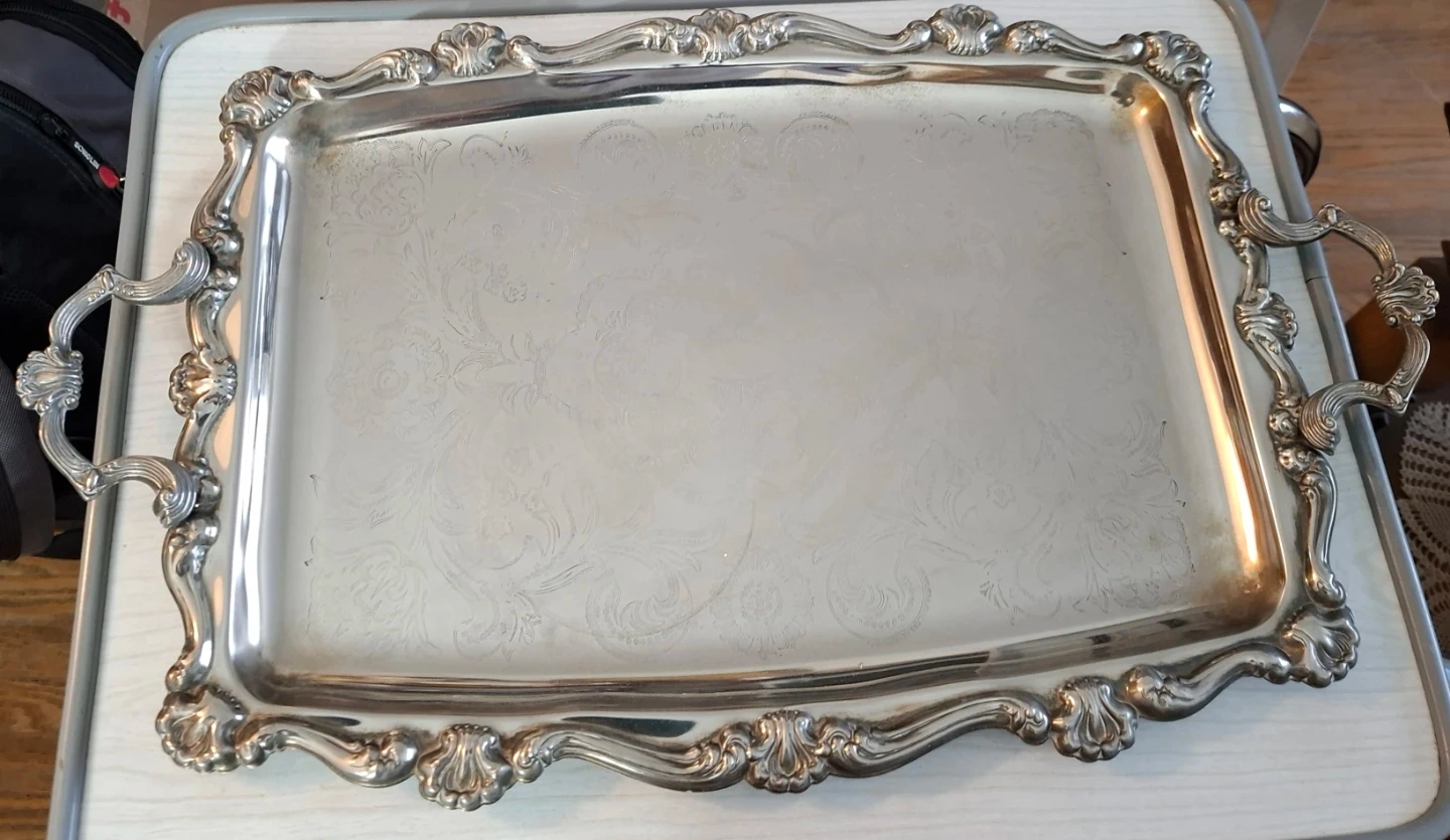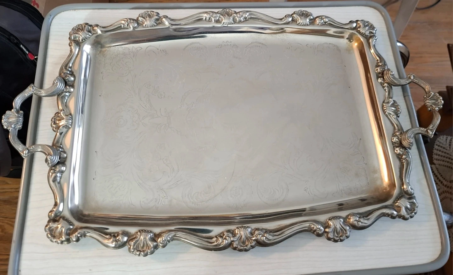 Ornate silver-tone serving tray with intricate floral etching. It has decorative handles on both sides. This tray is perfect for serving guests or as a decorative piece.