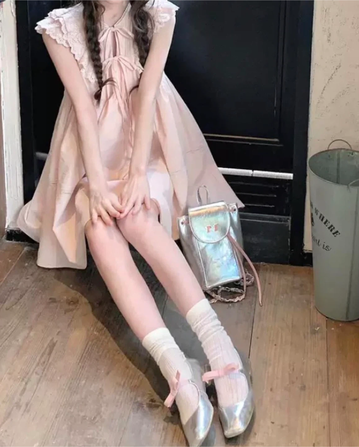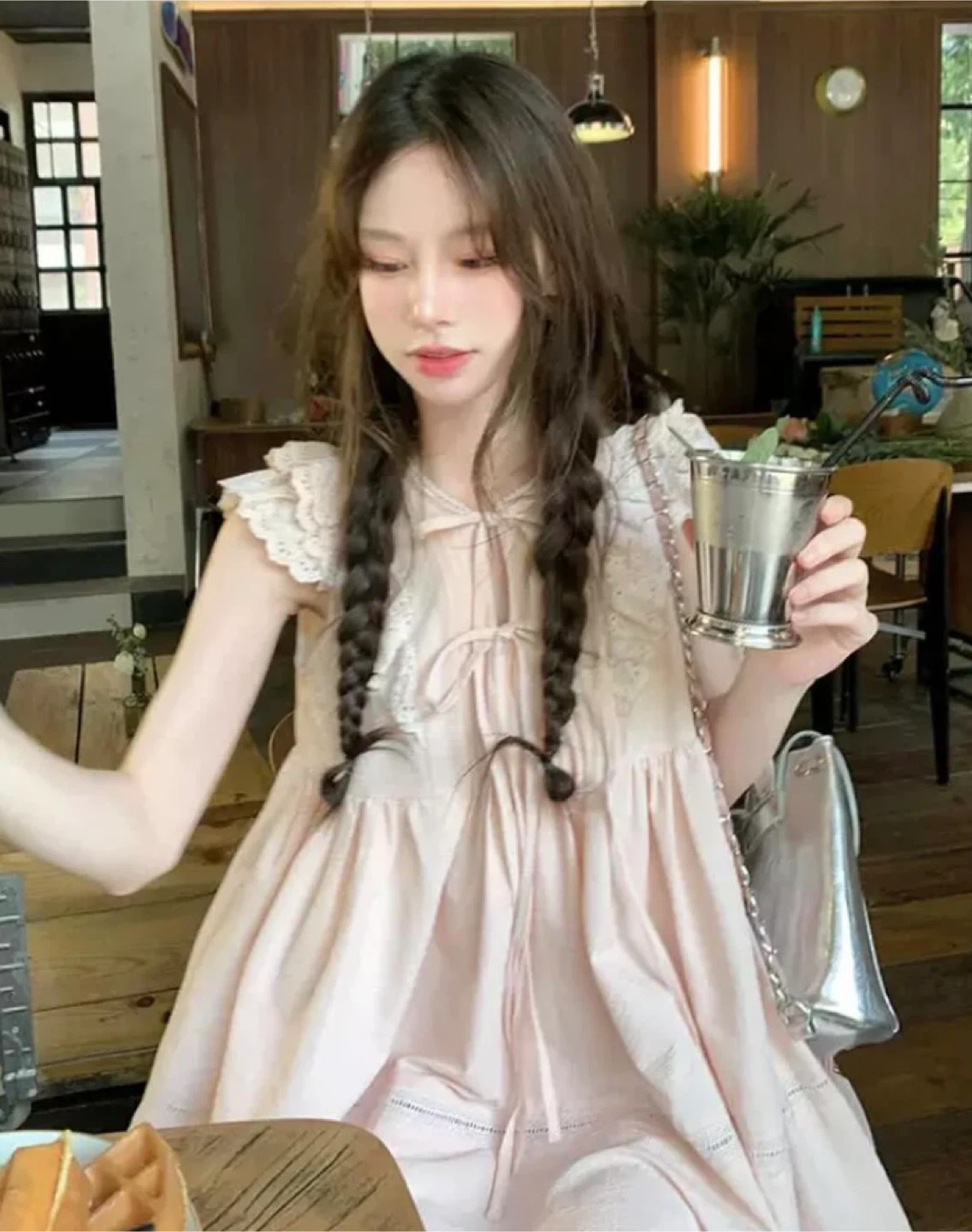 This light pink babydoll dress features a delicate lace trim and a charming tie-neck detail. It's made from a lightweight fabric, perfect for warmer days. The dress includes pretty puff sleeves with a scalloped lace edge. It's a lovely addition to any casual wardrobe!