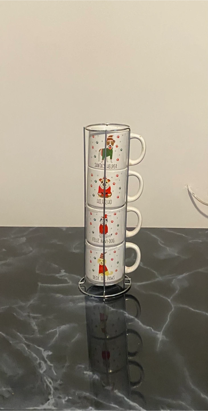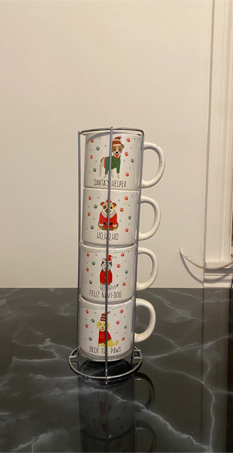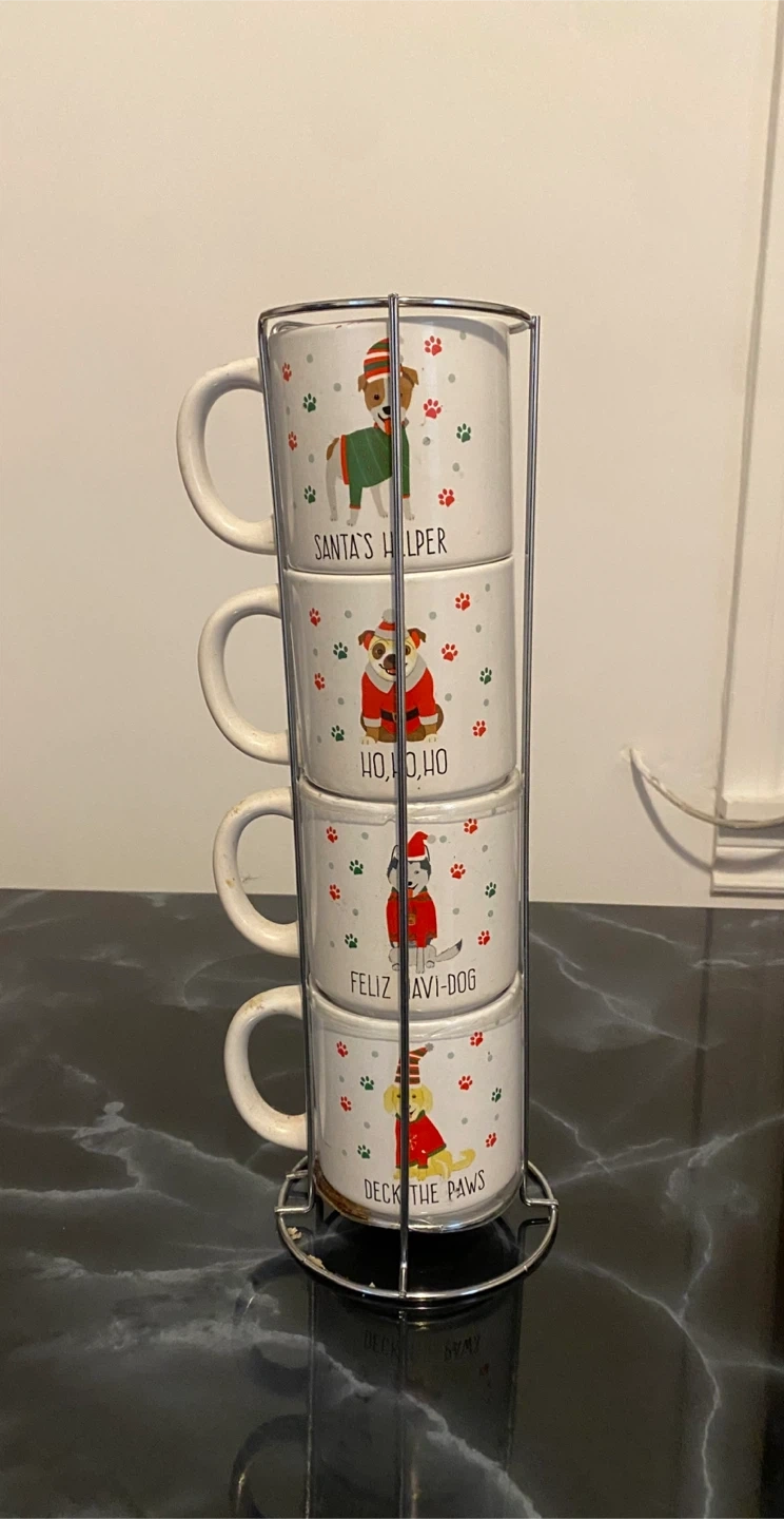 Set of four stacking mugs featuring adorable dogs in festive holiday designs. Each mug has a unique Christmas-themed graphic and text like "Santa's Helper" and "Deck the Paws." They come with a metal stand for easy storage. Perfect for enjoying your favorite warm beverages during the holiday season!