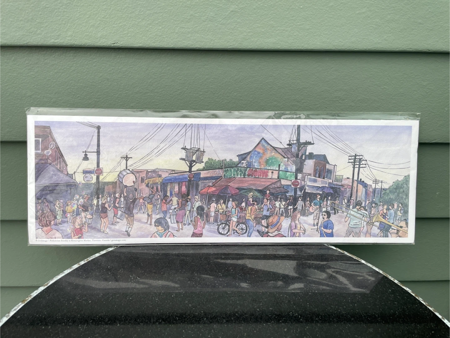 Art print depicting "Pedestrian Sunday at Kensington Market, Toronto". It's a colourful watercolour scene of a lively street market with musicians and crowds. The print measures 12 inches by 5 inches. Brand new