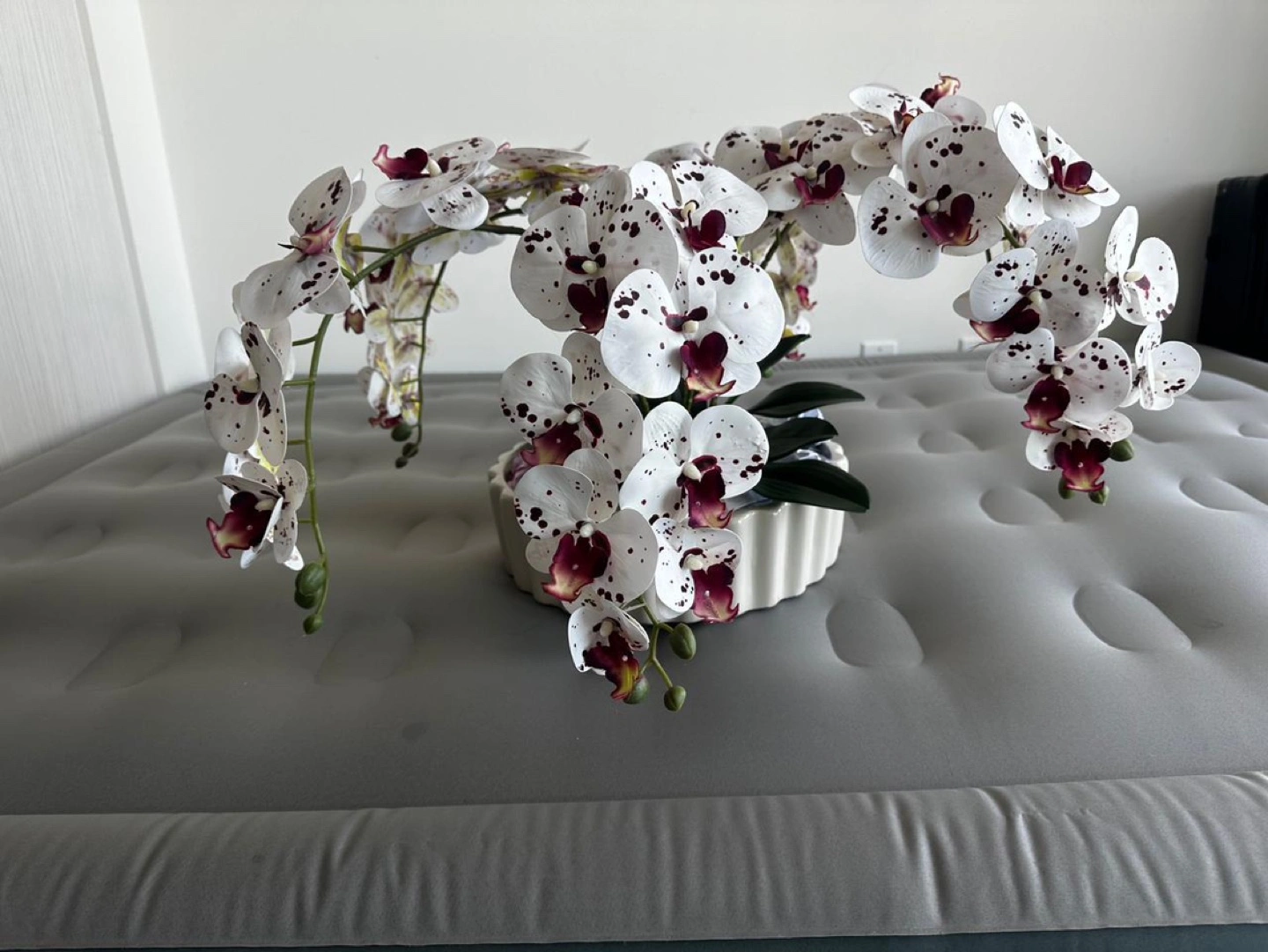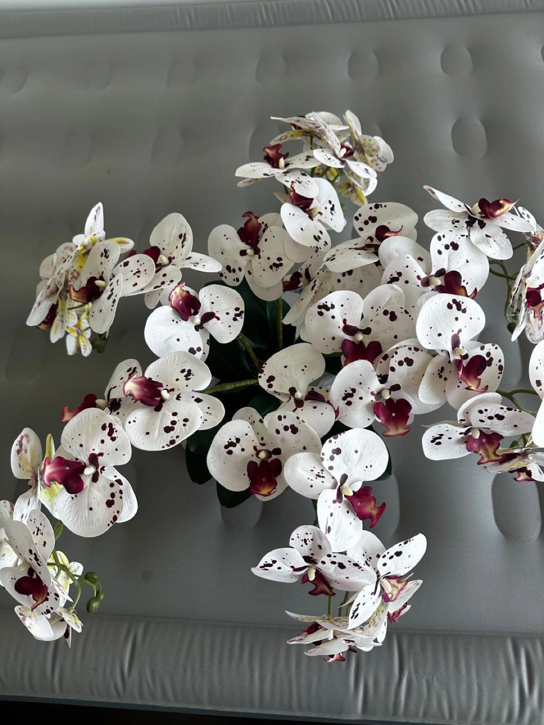 Beautiful artificial orchid arrangement. White flowers with dark purple spots. Planted in a simple white pot. Adds elegance to any space. Perfect for home or office decorations.