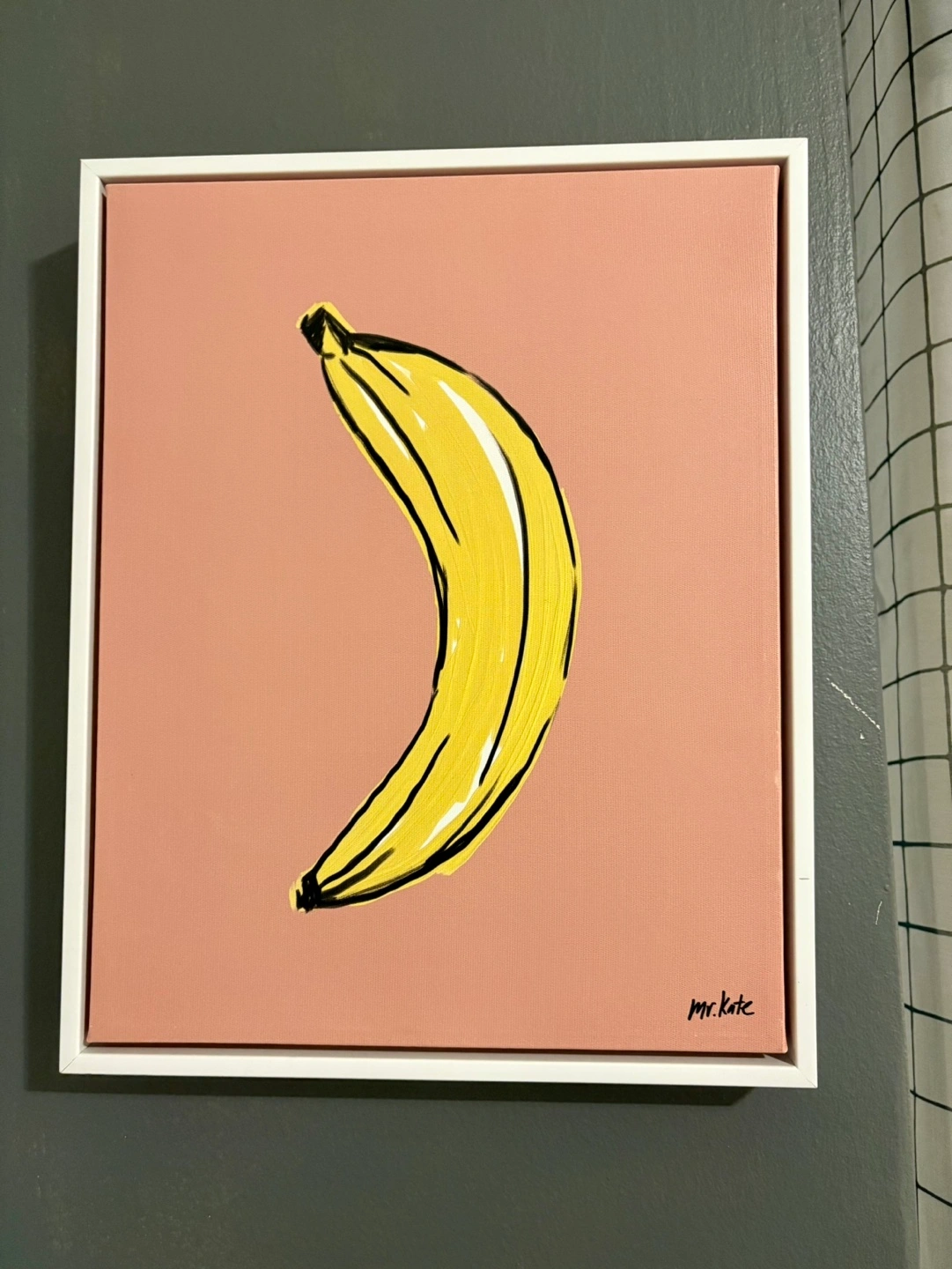 Framed canvas artwork print of a yellow banana on a pink background. Signed by the artist, Mr. Kate. Pick up Bathurst and Ridge Hill and cash only.