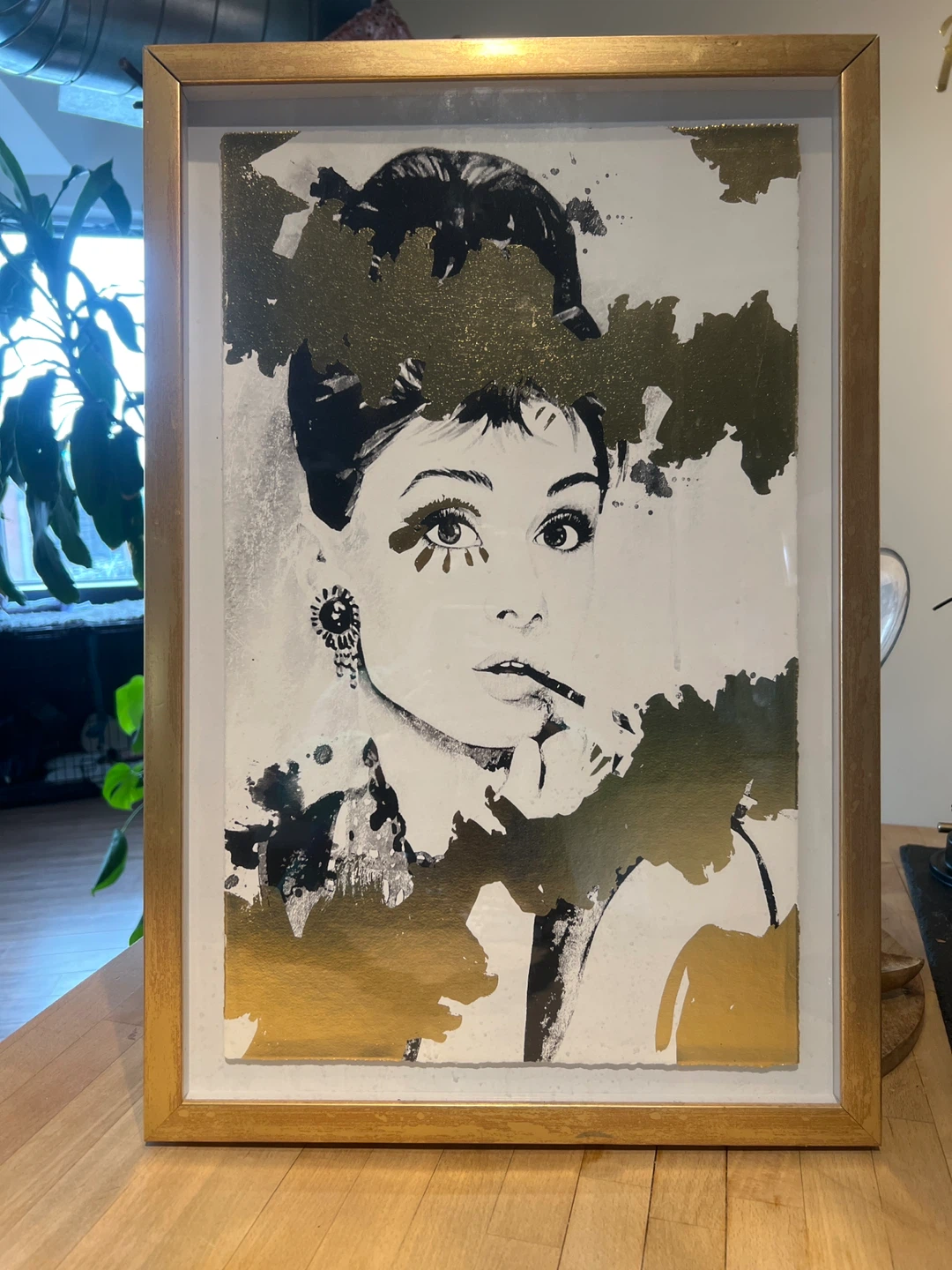 This framed art print features a striking black and white portrait of Audrey Hepburn. Gold leaf accents add a touch of glamour to the design. It's ready to hang and would make a chic addition to any room.