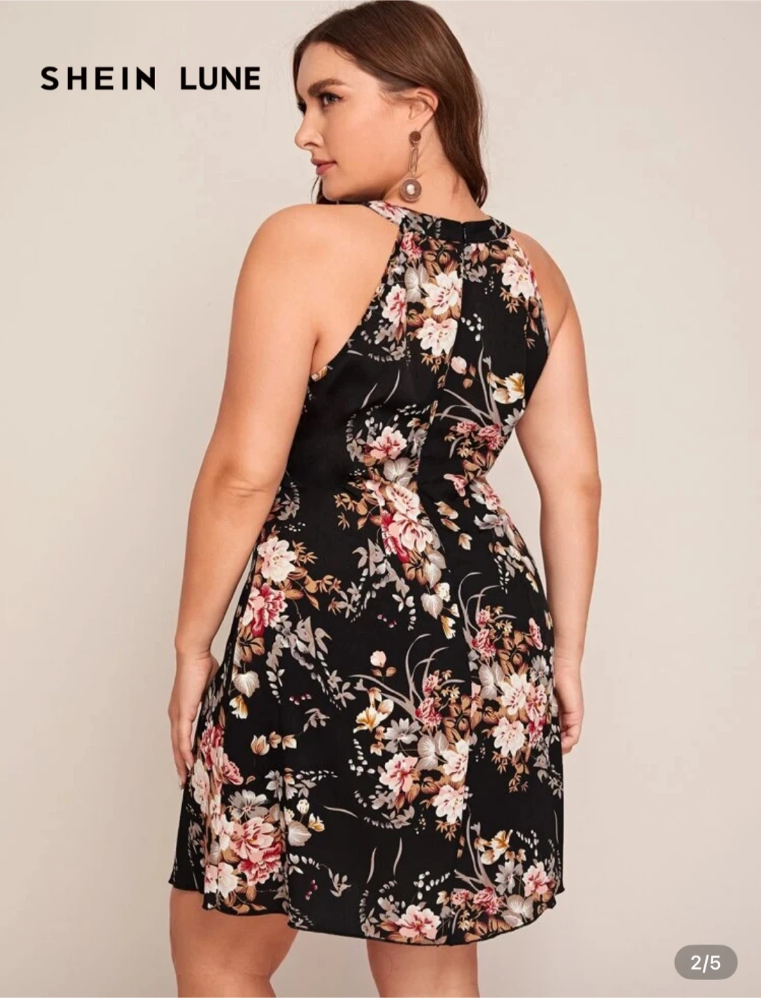 SHEIN LUNE floral print halter neck dress. It's a sleeveless style with a short hem. This dress is made with fabric that drapes nicely.