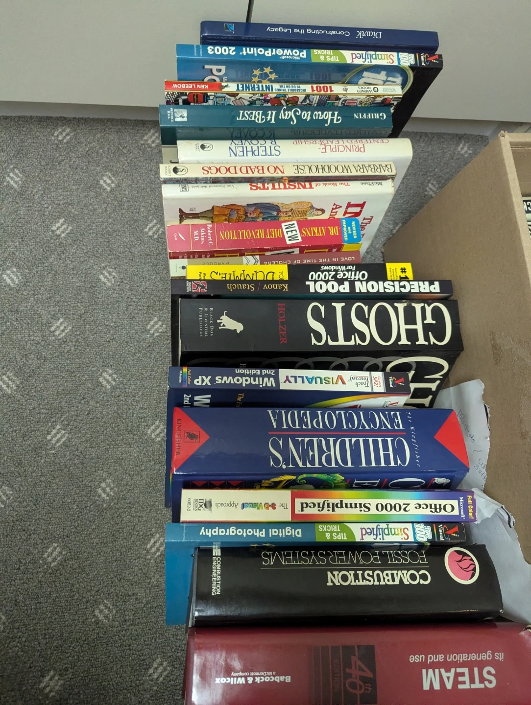 A collection of books, including titles like 'Children's Encyclopedia,' 'Office 2000 Simplified,' 'Fossil Power Systems,' and 'Constructing the Legacy'