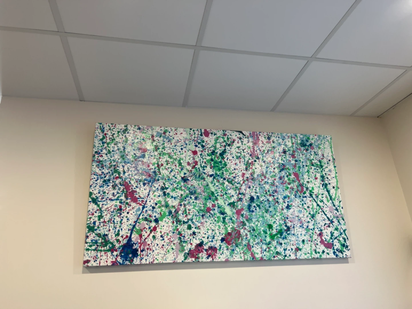 A vibrant abstract canvas painting with a splatter design. Features a mix of blues, greens, and pinks on a white background. This piece is ready to hang and would make a great addition to any room's decor!