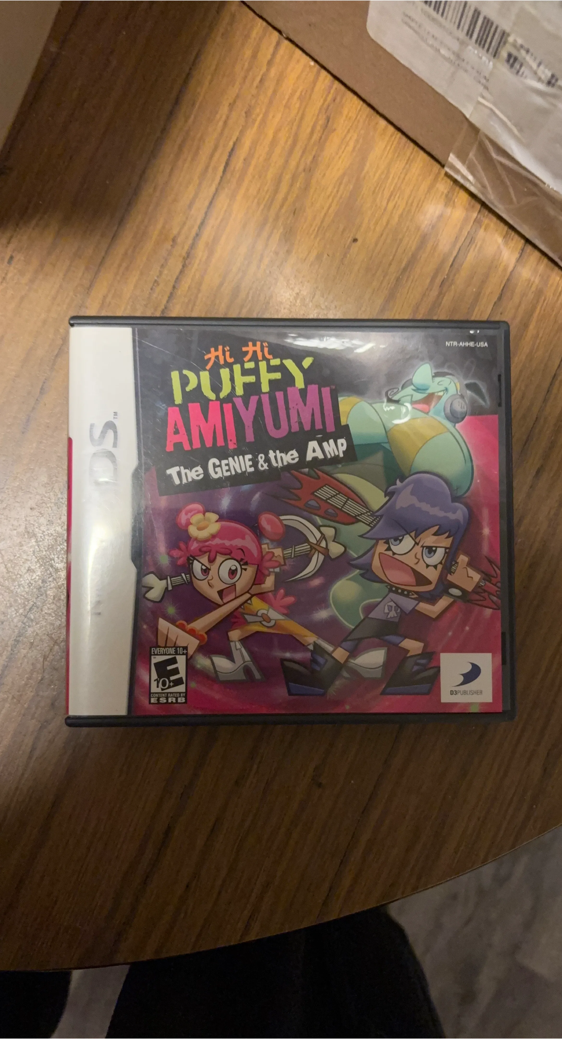 This is the Nintendo DS game "Hi Hi Puffy AmiYumi: The Genie & The Amp". It's rated E for Everyone 10+ by the ESRB. The game was published by D3Publisher.