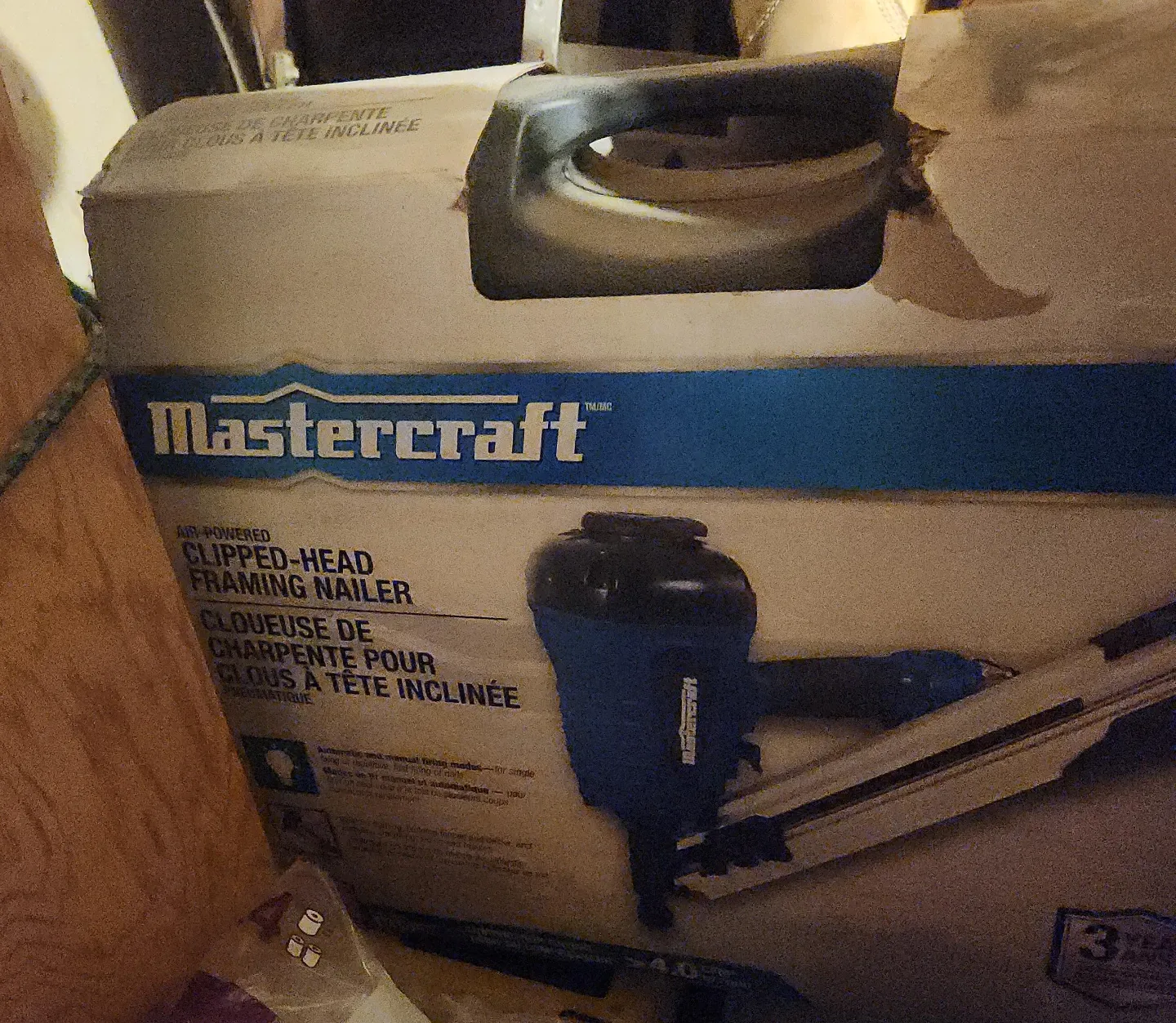 This Mastercraft framing nailer is air-powered for efficient fastening. It's designed for clipped-head nails. This tool is suitable for construction framing tasks.never used (brand new)