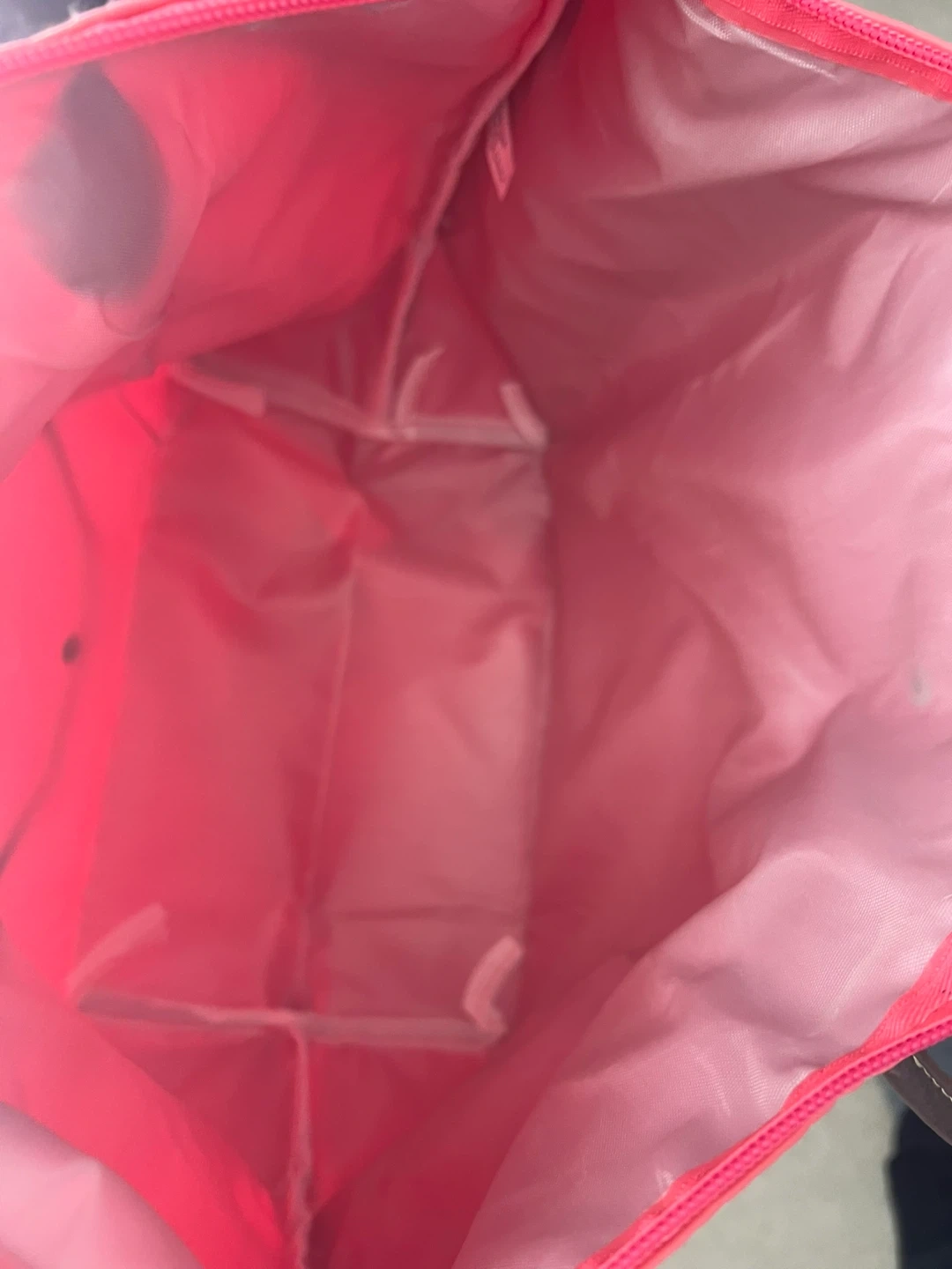 A stylish pink nylon tote bag with brown leather handles. It's great for everyday use! The interior has multiple compartments for organization.