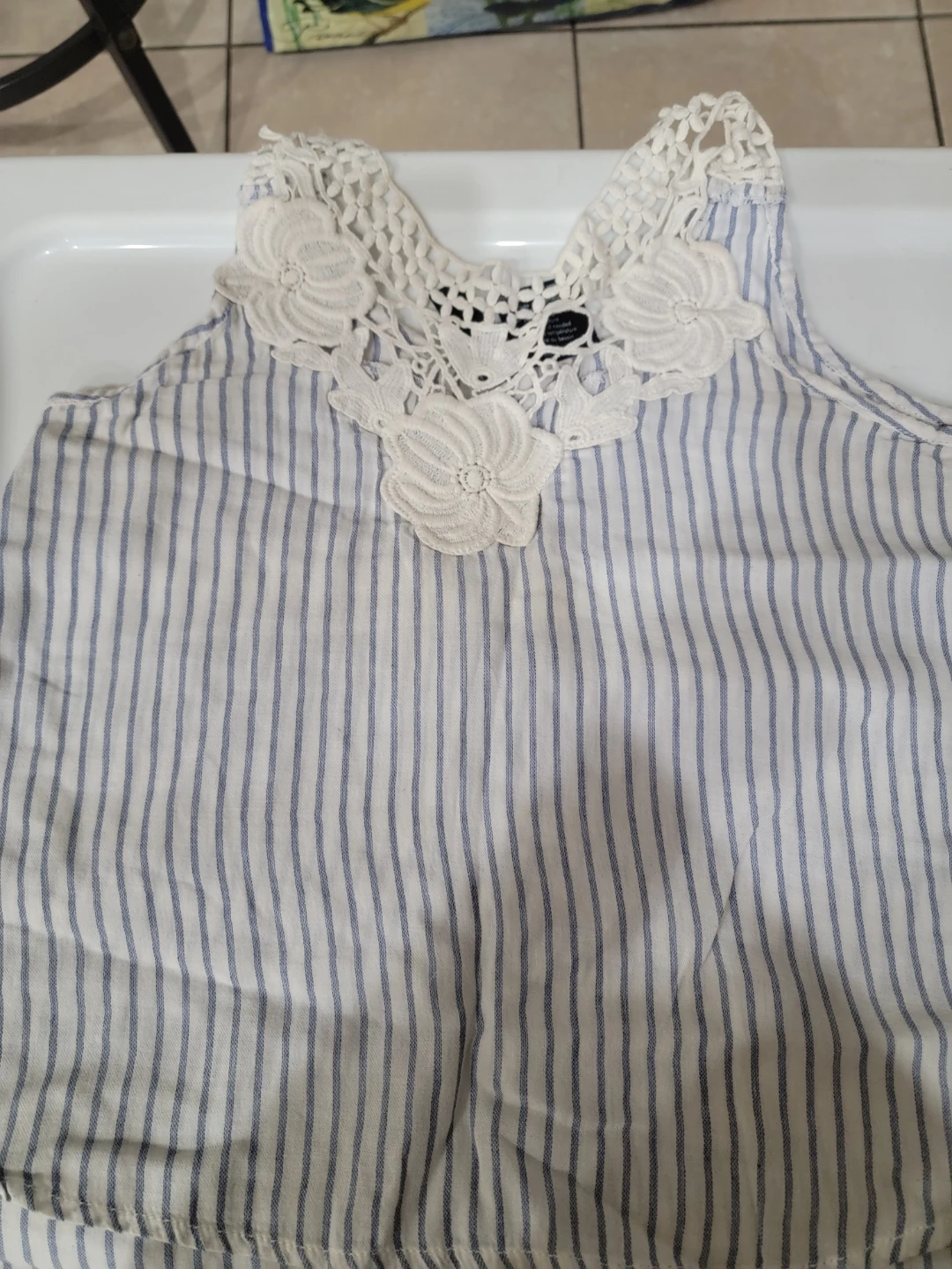 This is a white and blue striped tank top. It features a beautiful crochet lace collar with floral details. The material is lightweight and breathable, perfect for warmer weather. It's a stylish and comfortable piece.