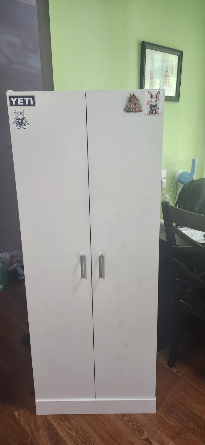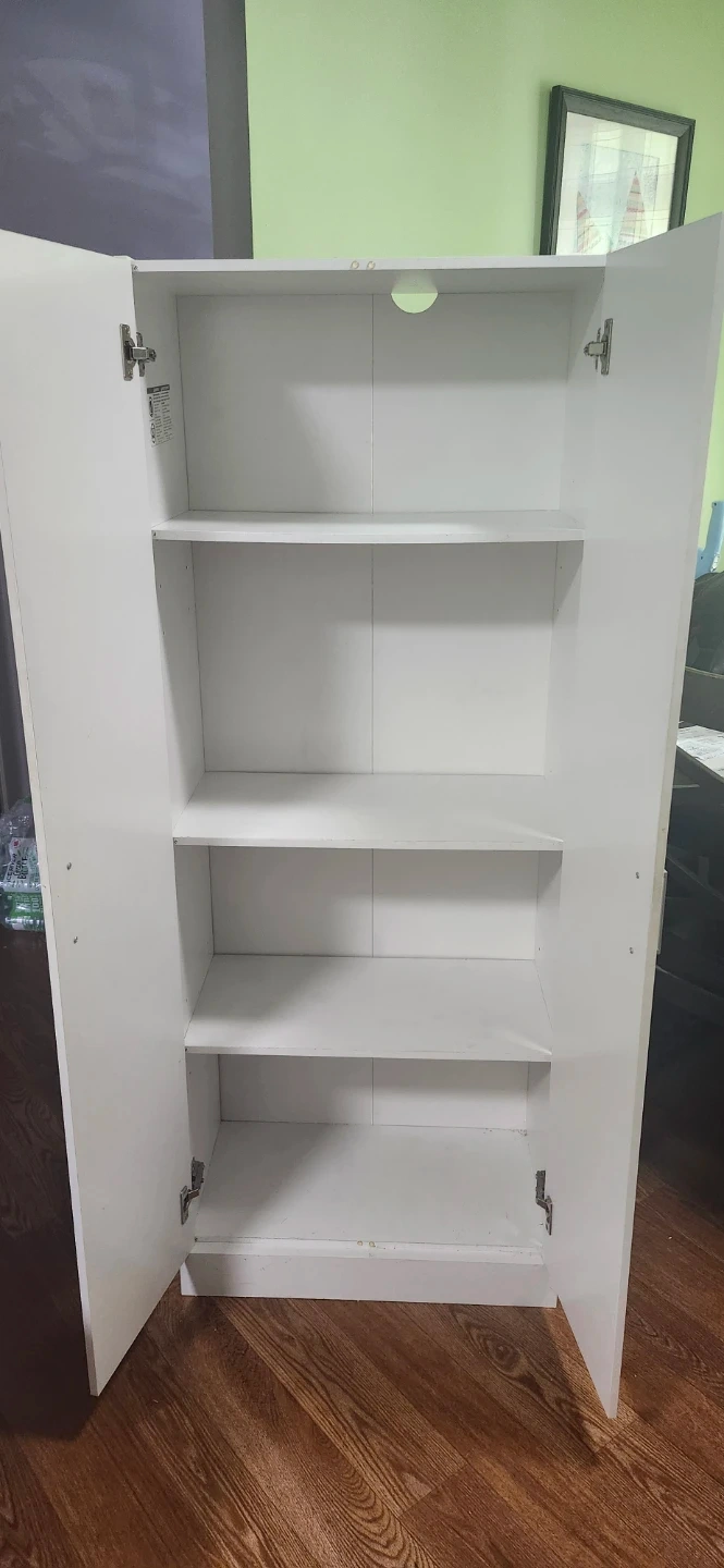 This is a white storage cabinet with double doors and three interior shelves. It's a versatile piece for organizing your home. Perfect for storing linens, books, or general household items.