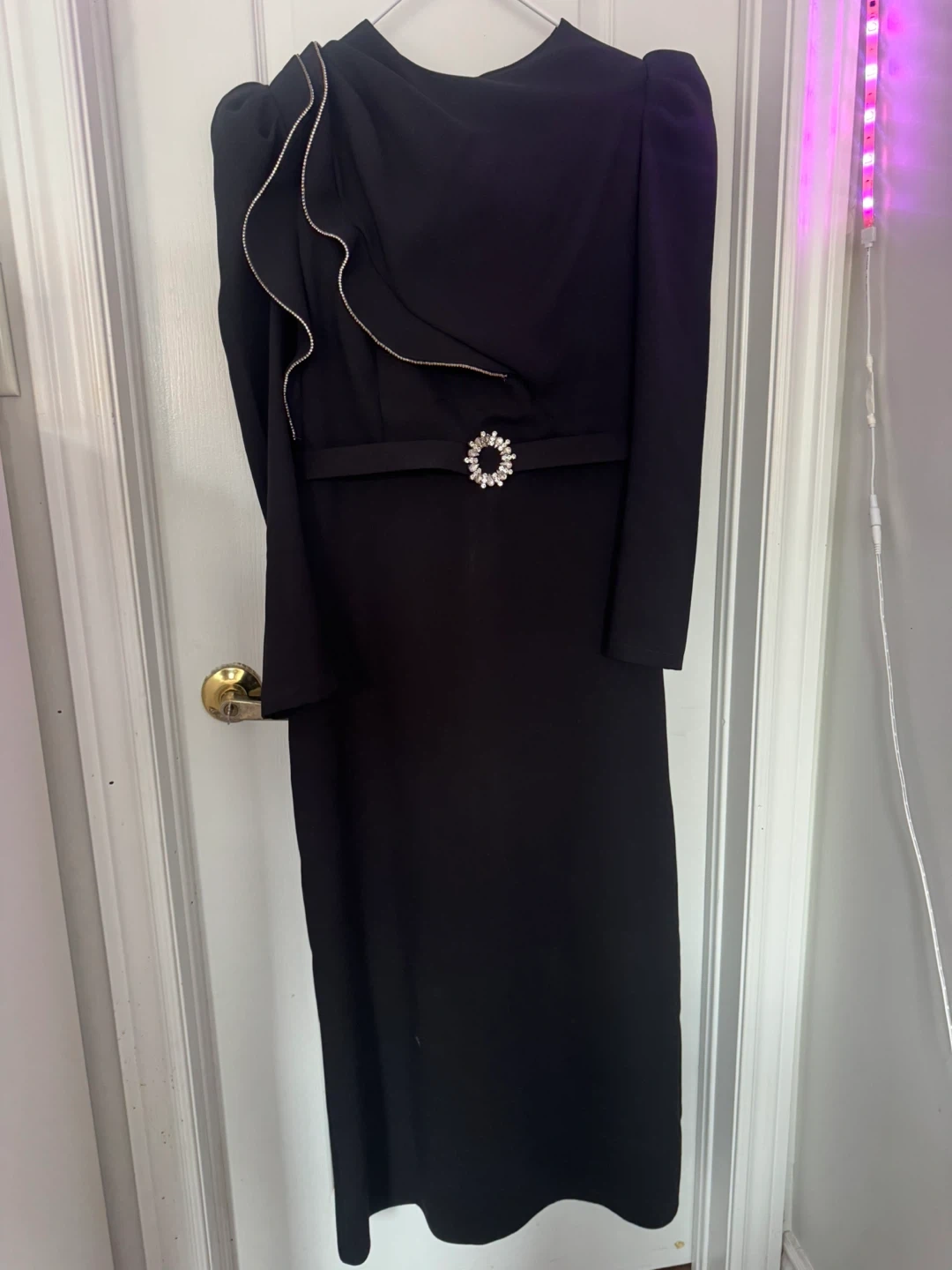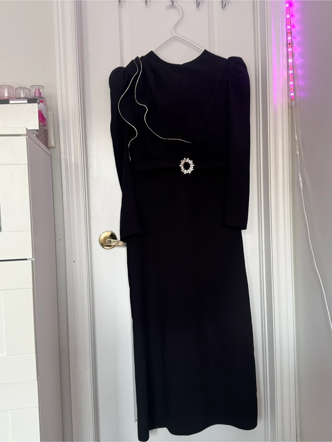 I'm selling a beautiful black dress that's perfect for a night out or a special occasion! It has a unique rhinestone detail along the neckline and a rhinestone buckle at the waist. The dress is in great condition and ready for a new home!