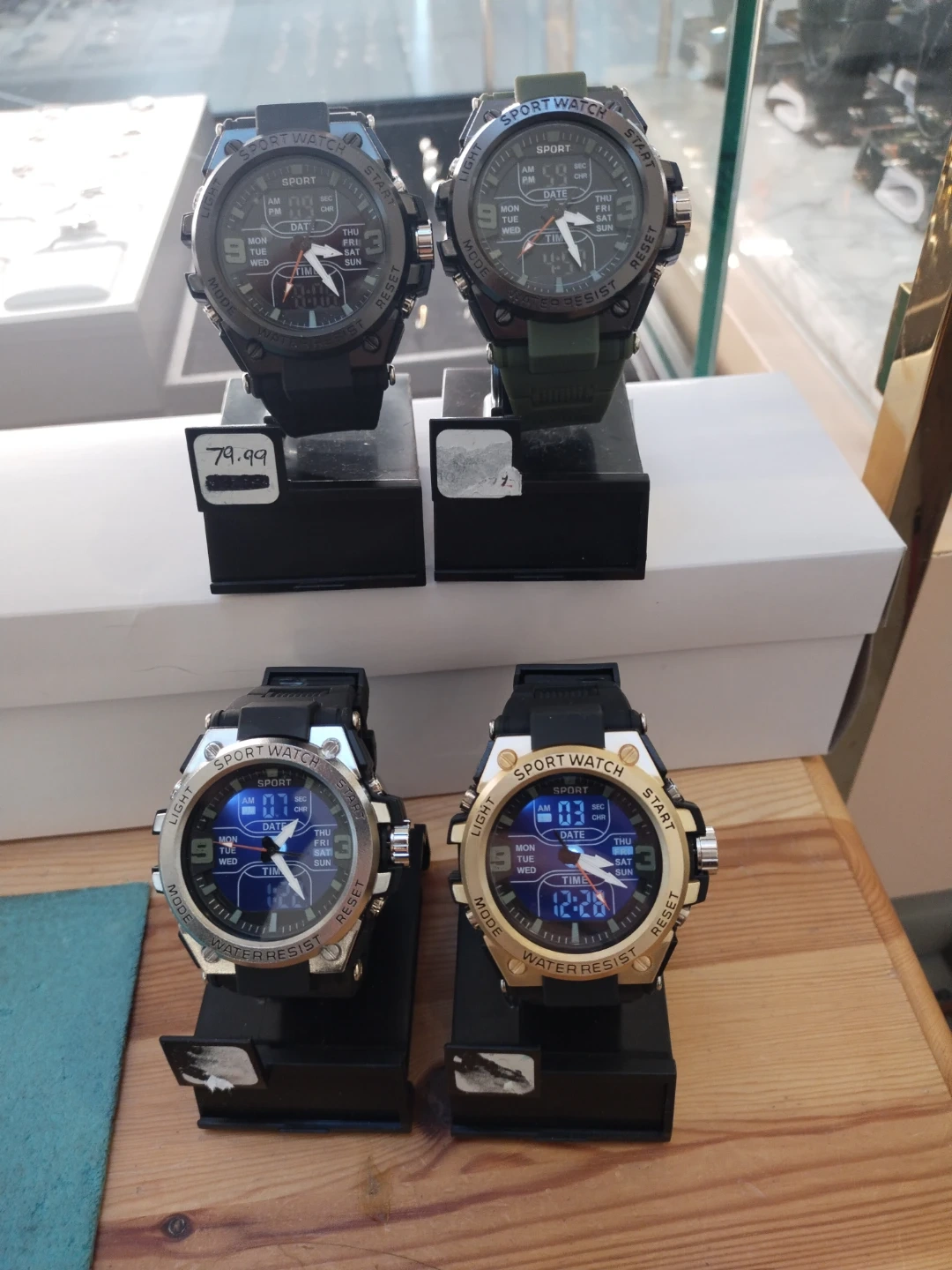 Selling a sport watch. It has a digital display showing the time, date, and day of the week. It also features mode and start buttons, and water resistance.