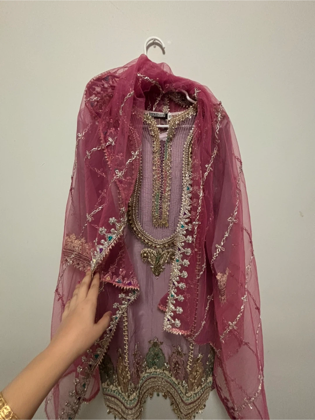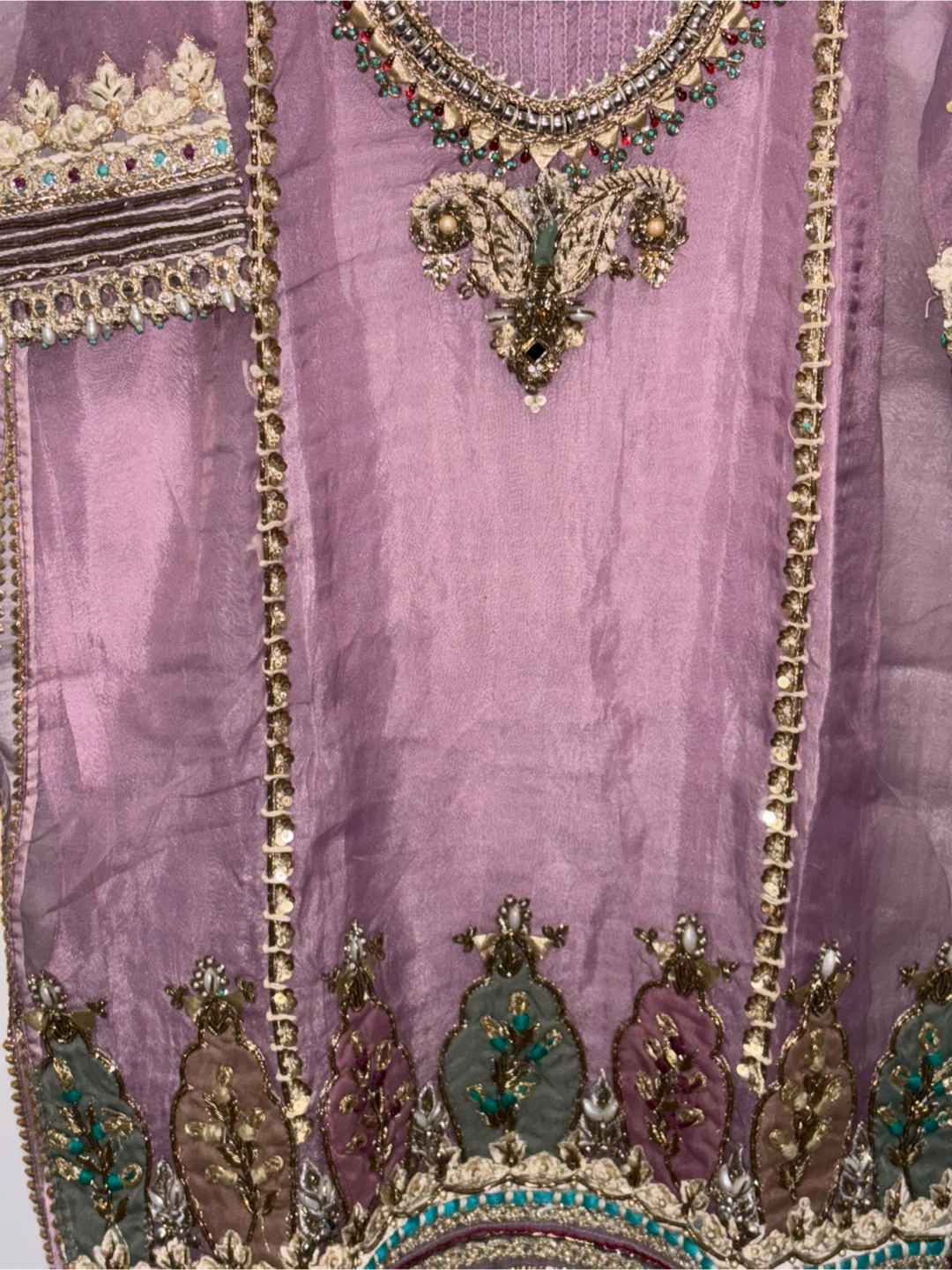Beautifully embroidered three-piece Pakistani salwar kameez set. Features intricate beadwork, sequins, and detailed embroidery on a lilac kameez and matching patterned trousers. Comes with a sheer dupatta with embellished borders. This outfit is perfect for festive occasions and celebrations!
