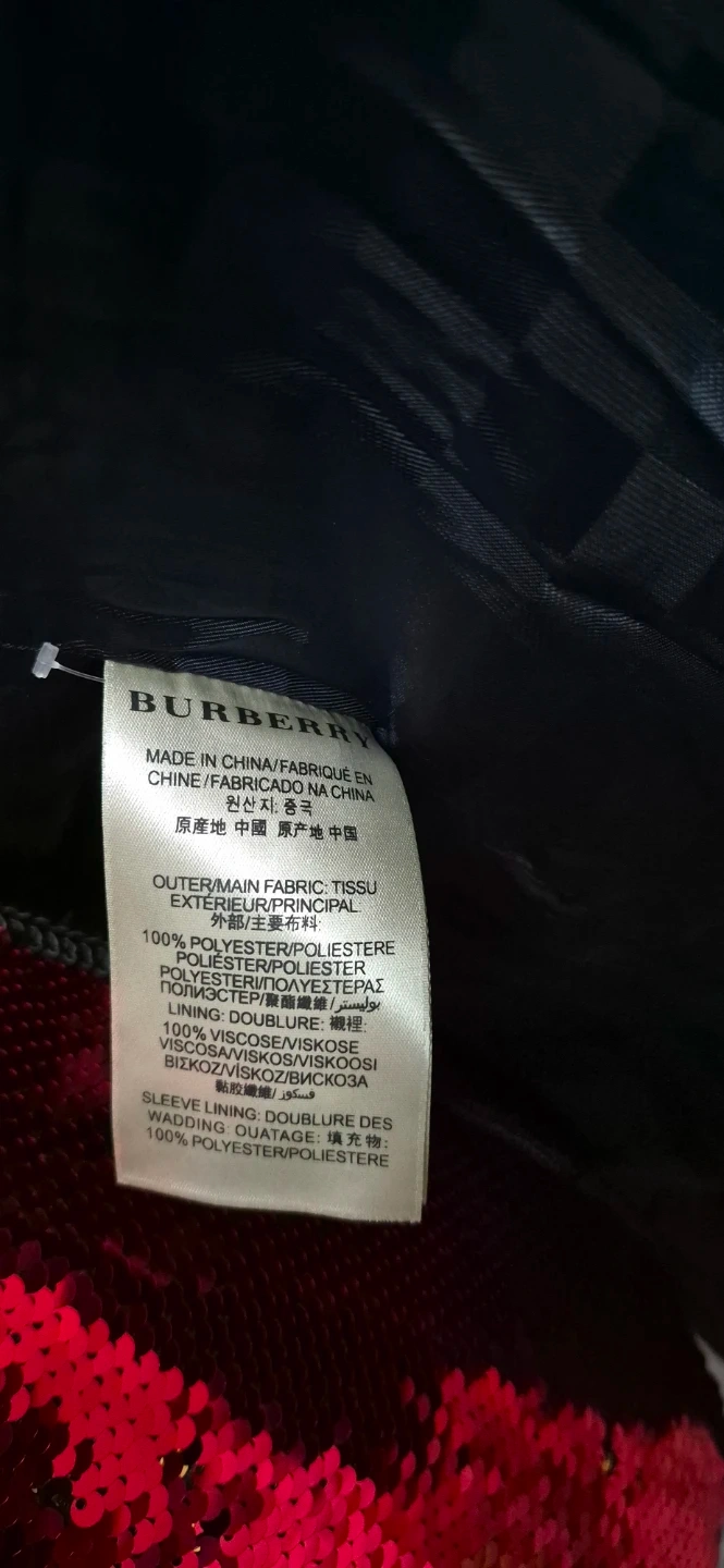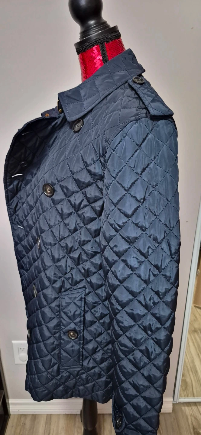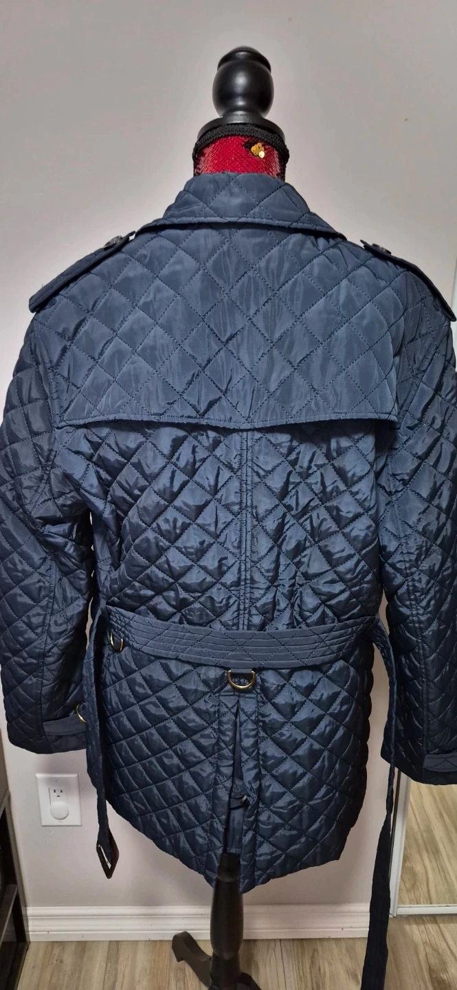 Navy blue Burberry quilted jacket. Features a double-breasted closure and a belted waist. Made with 100% polyester outer and lining.