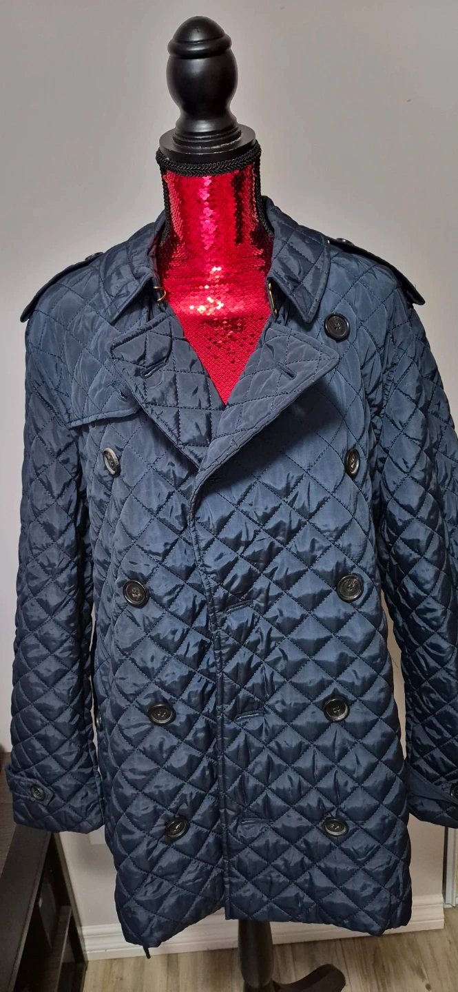 Navy blue Burberry quilted jacket. Features a double-breasted closure and a belted waist. Made with 100% polyester outer and lining.