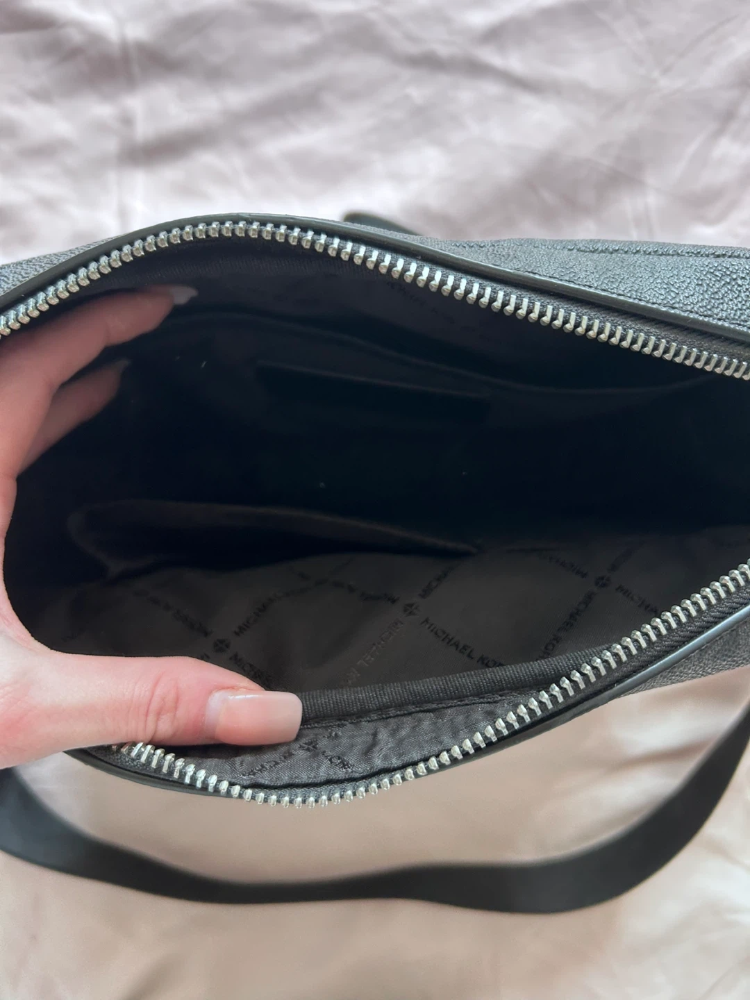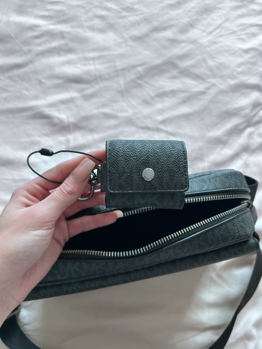Black Michael Kors crossbody bag featuring the signature MK monogram pattern. It comes with a detachable small pouch. Zip closure provides secure storage. Great for everyday use!