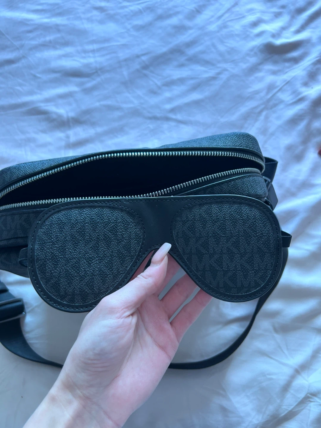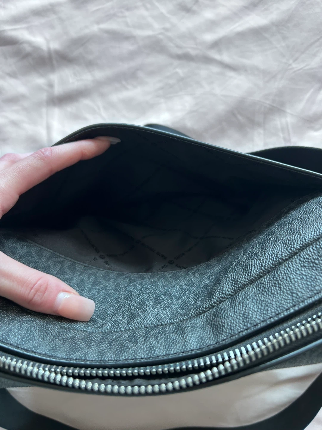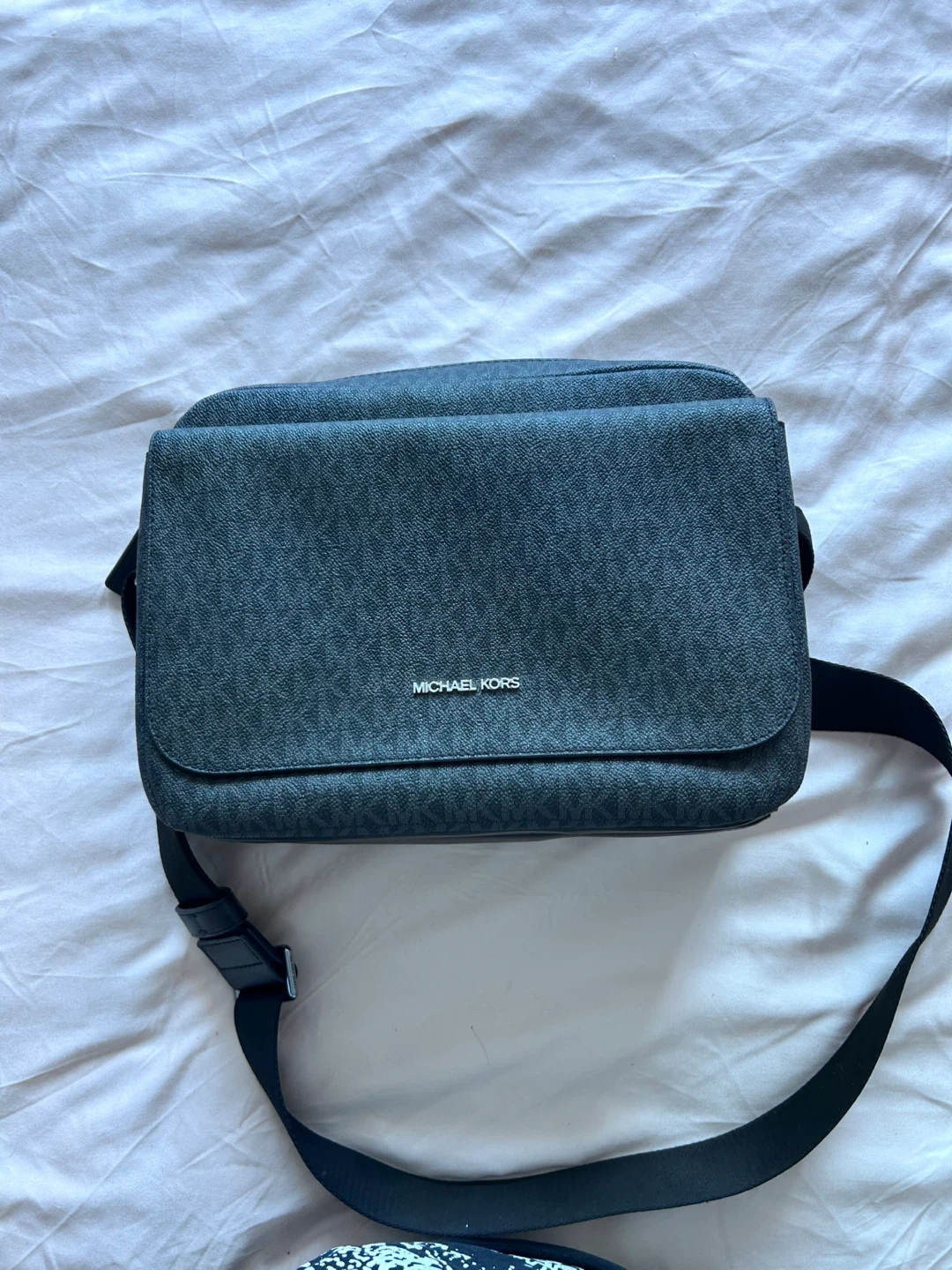 Black Michael Kors crossbody bag featuring the signature MK monogram pattern. It comes with a detachable small pouch. Zip closure provides secure storage. Great for everyday use!