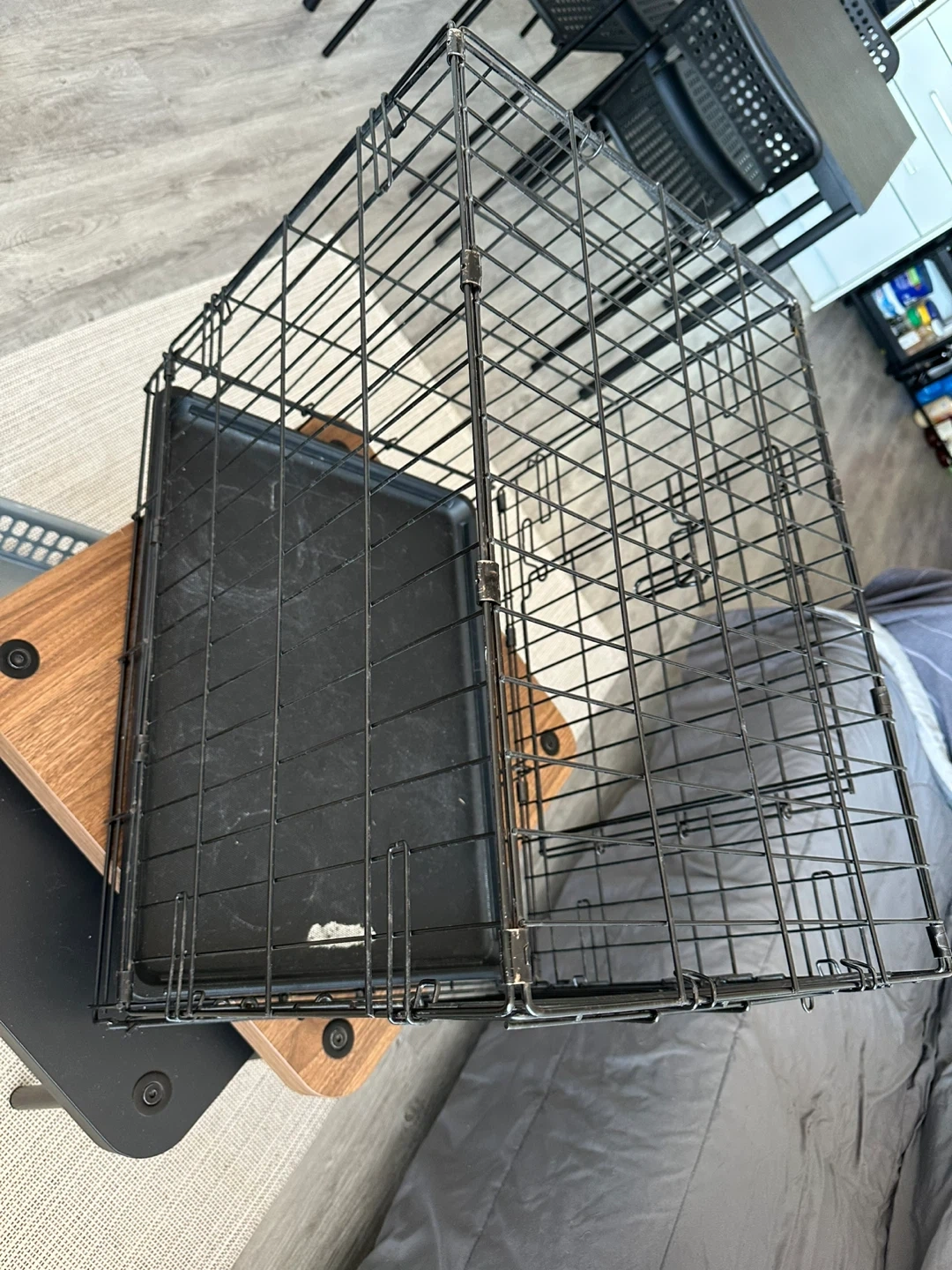 Includes a soft, grey and white plush pet bed and a wire dog crate with a black plastic tray. The crate is collapsible for easy storage. Great for small to medium-sized dogs!