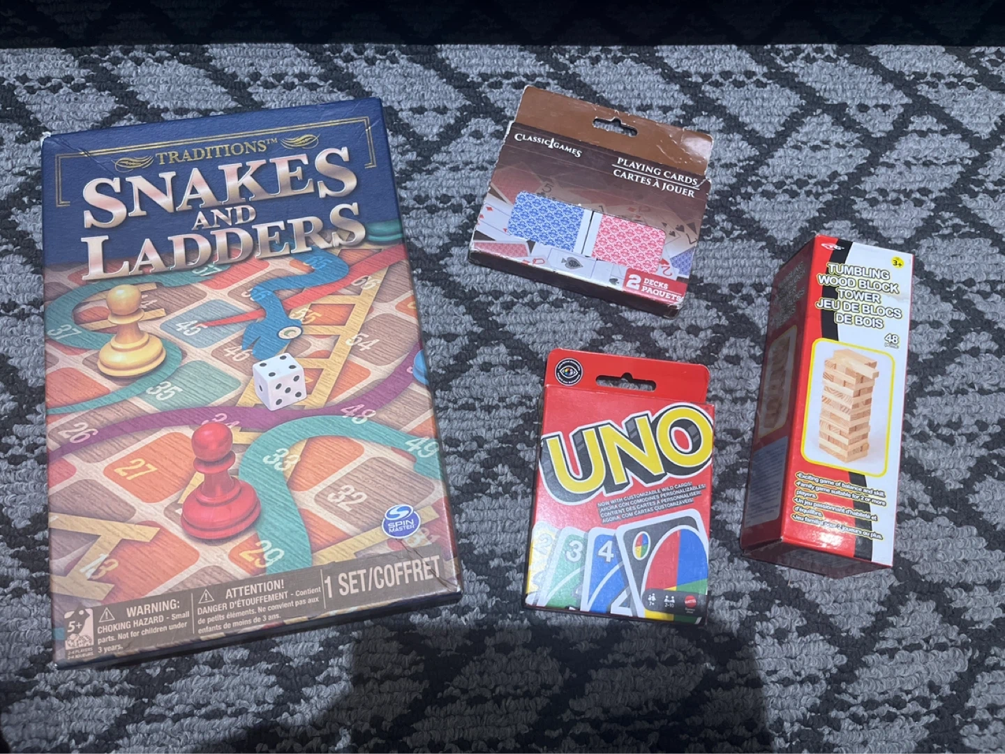 This set includes Traditional Snakes and Ladders, UNO, a Tumbling Wood Block Tower game, and two decks of playing cards. All games are suitable for ages 5 and up, except for the wood block tower which is for ages 3+.