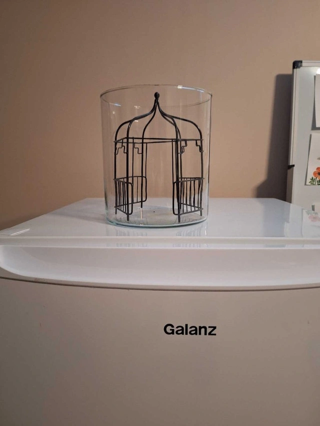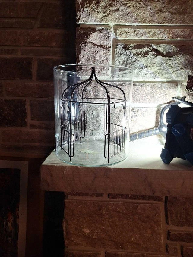 Glass terrarium, approximately 8 inches high and 6 inches round, with a decorative metal gazebo frame. Perfect for a succulent plant garden, dried floral arrangement, or sand castle. Asking $10 cash. Curbside pickup in South Ajax. Very good condition.