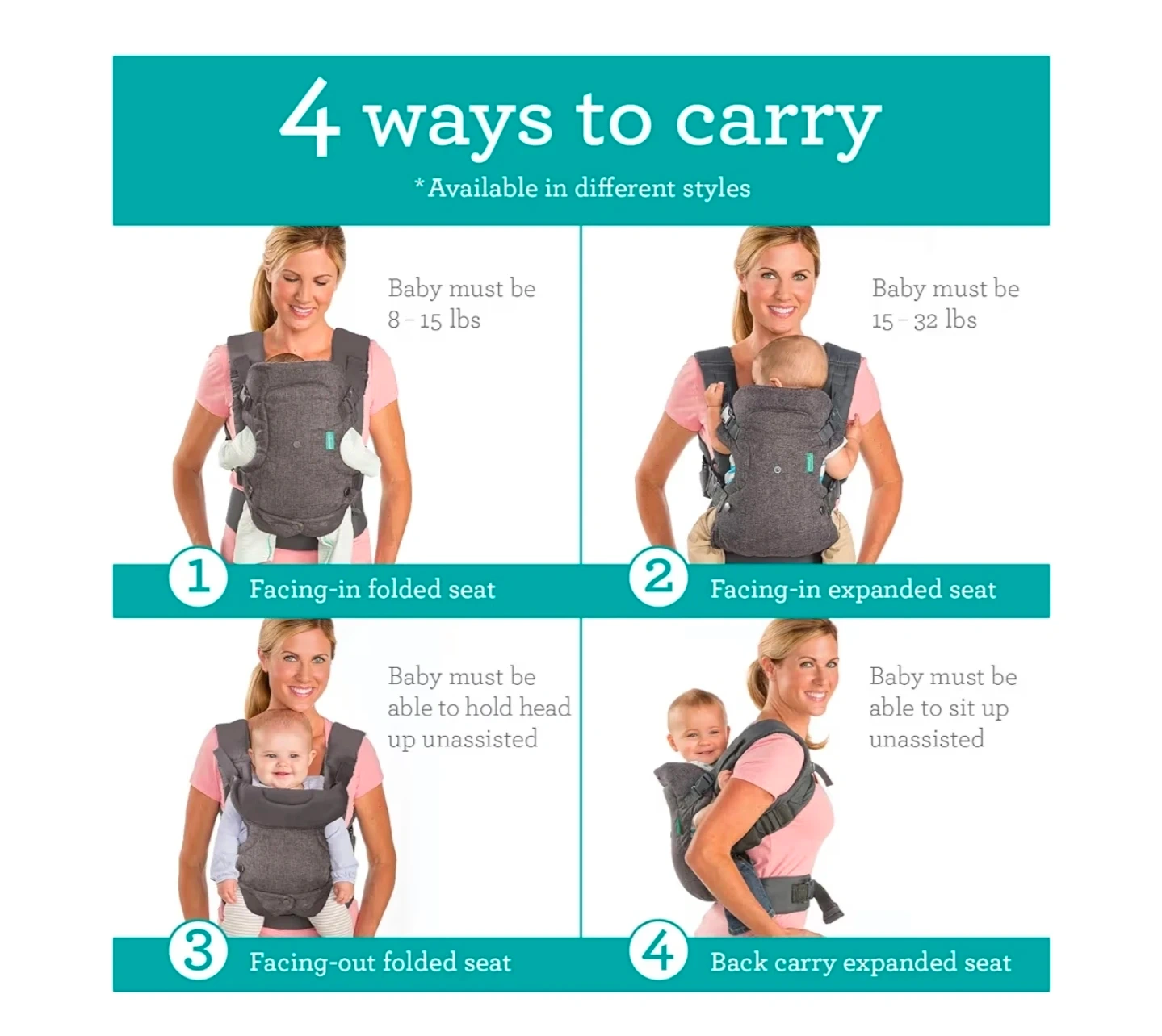 This Infantino baby carrier is grey and has adjustable straps for a comfortable fit. It supports babies from 8-32 lbs and offers four carrying positions. It's designed for a natural ergonomic 'M' seat position when facing in.