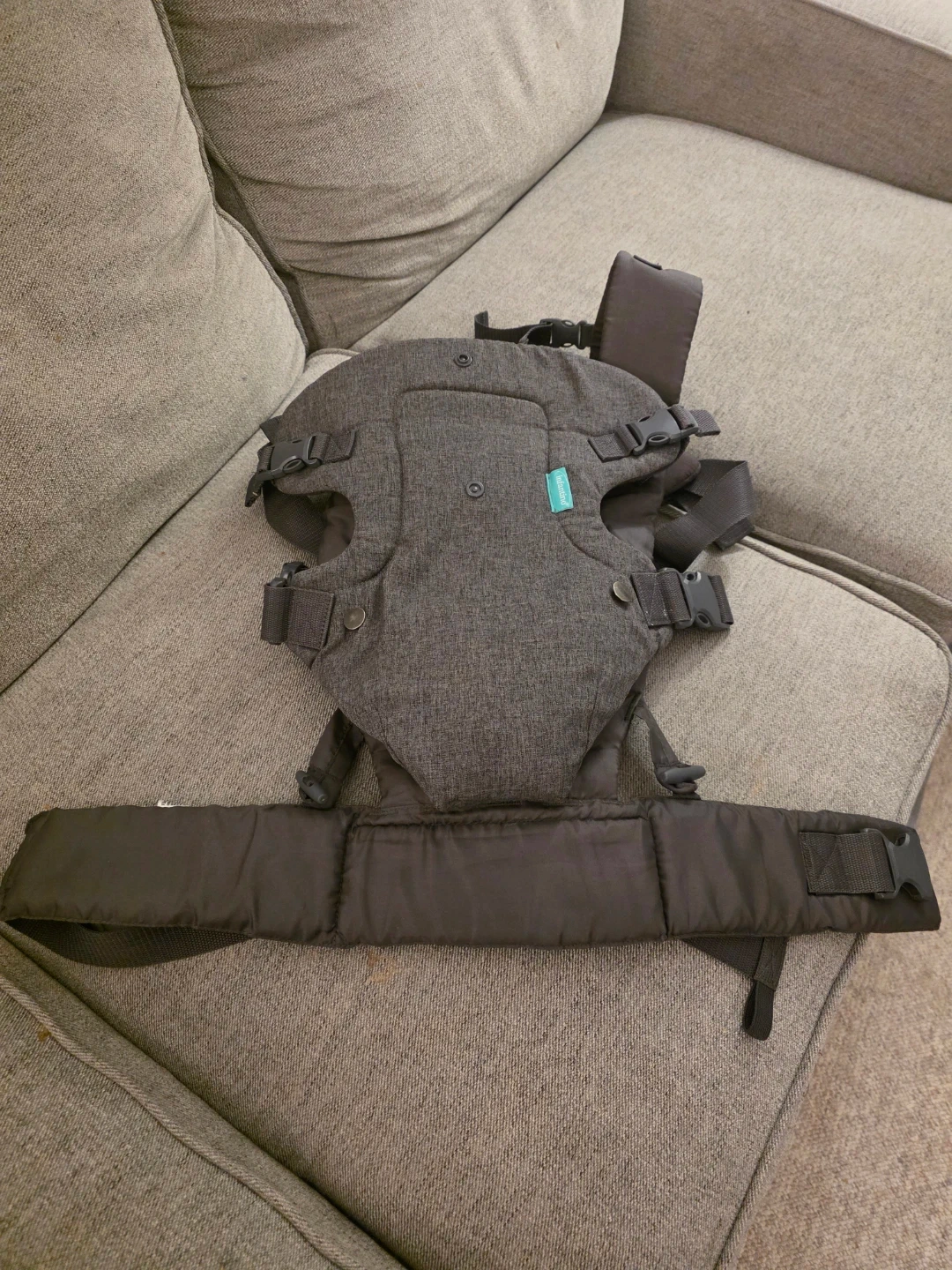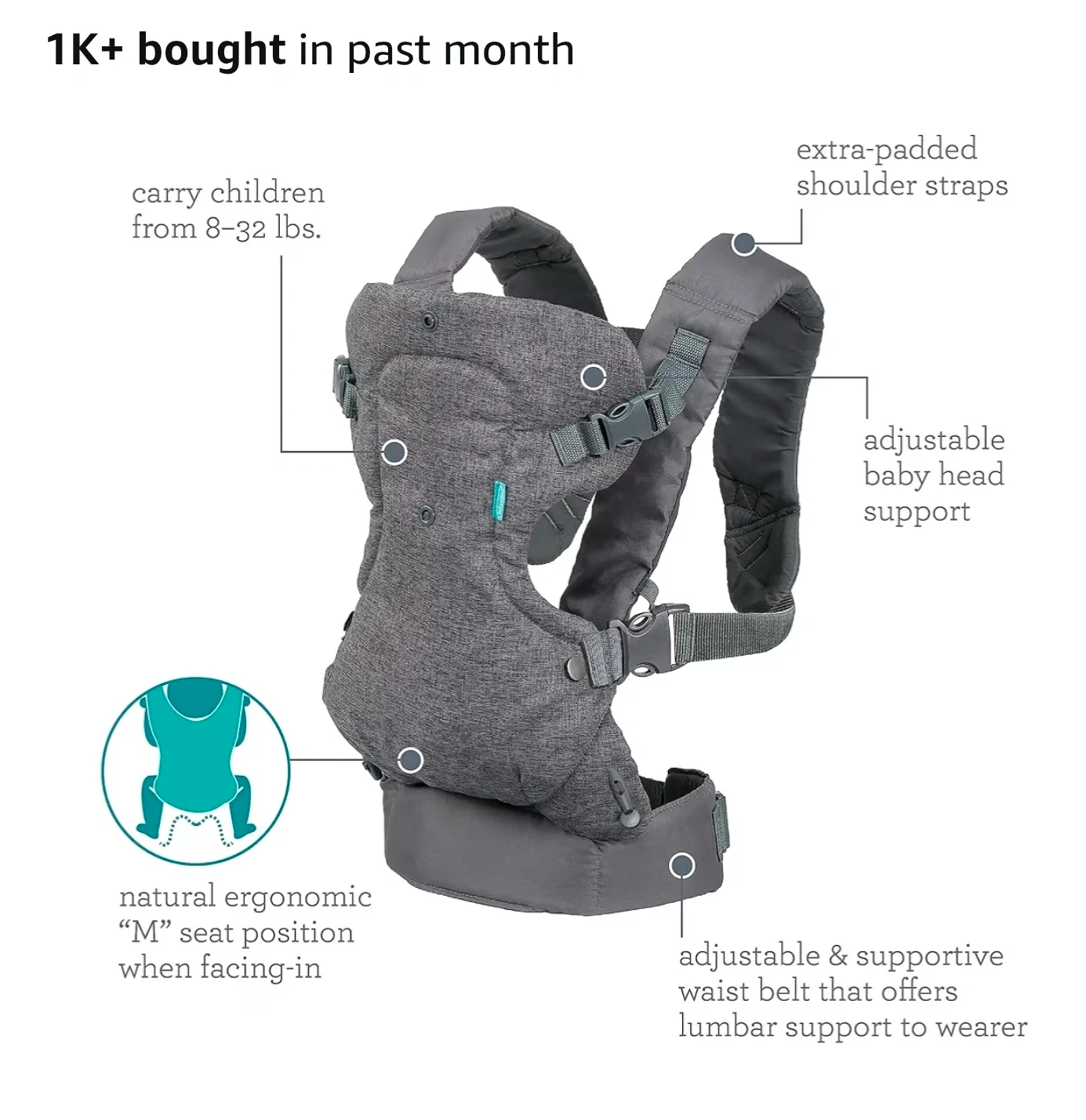 This Infantino baby carrier is grey and has adjustable straps for a comfortable fit. It supports babies from 8-32 lbs and offers four carrying positions. It's designed for a natural ergonomic 'M' seat position when facing in.