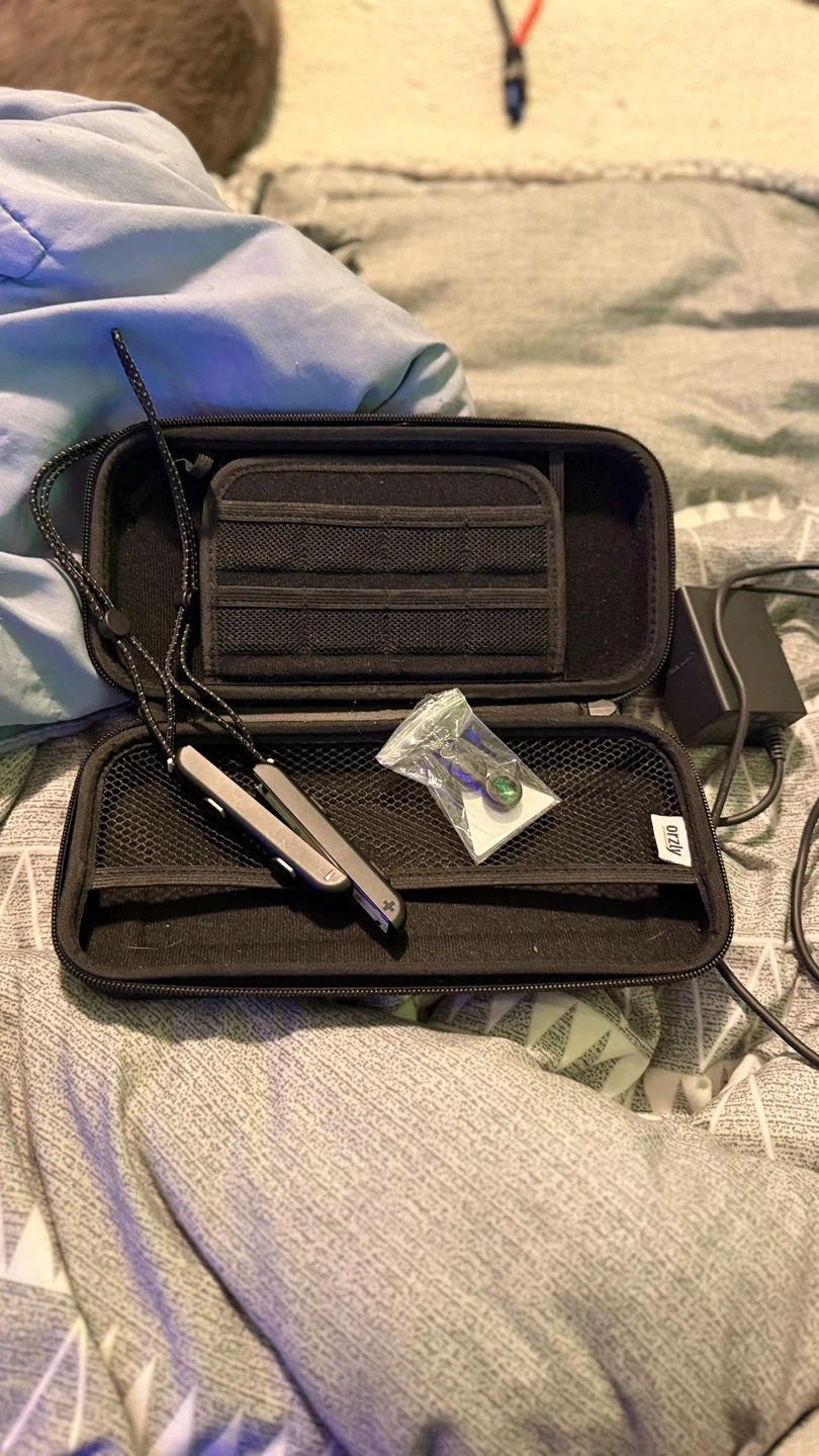 This pink carrying case fits a Nintendo Switch. It's designed to protect your console and comes with a lanyard, thumb grips, and a small bag for accessories. Plenty of storage for games and cards!