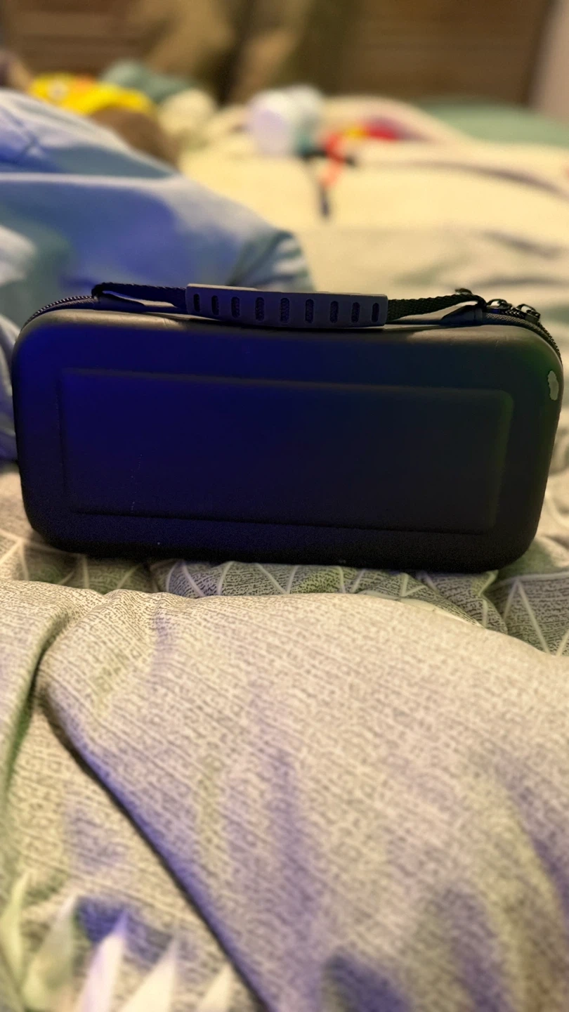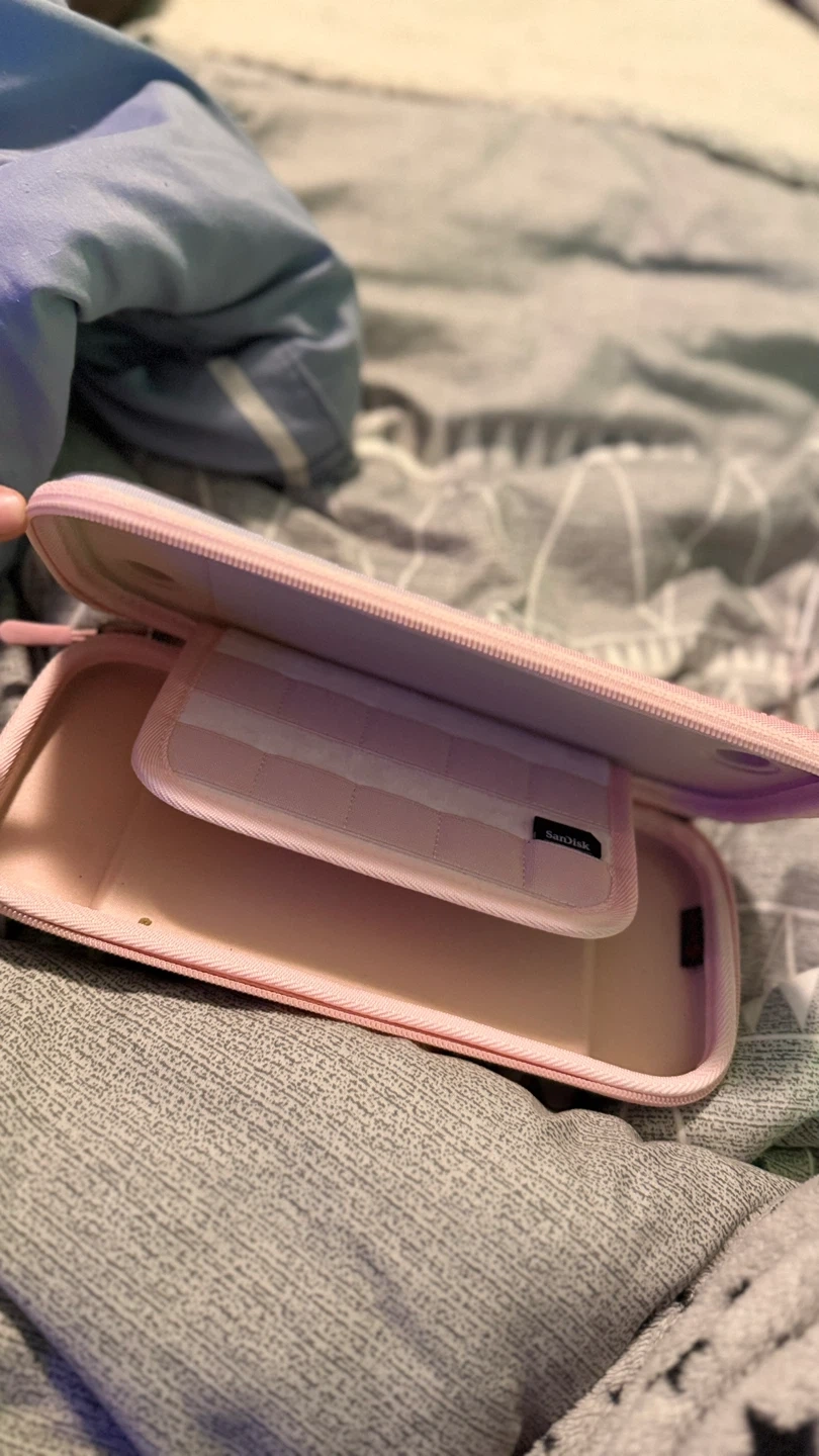 This pink carrying case fits a Nintendo Switch. It's designed to protect your console and comes with a lanyard, thumb grips, and a small bag for accessories. Plenty of storage for games and cards!