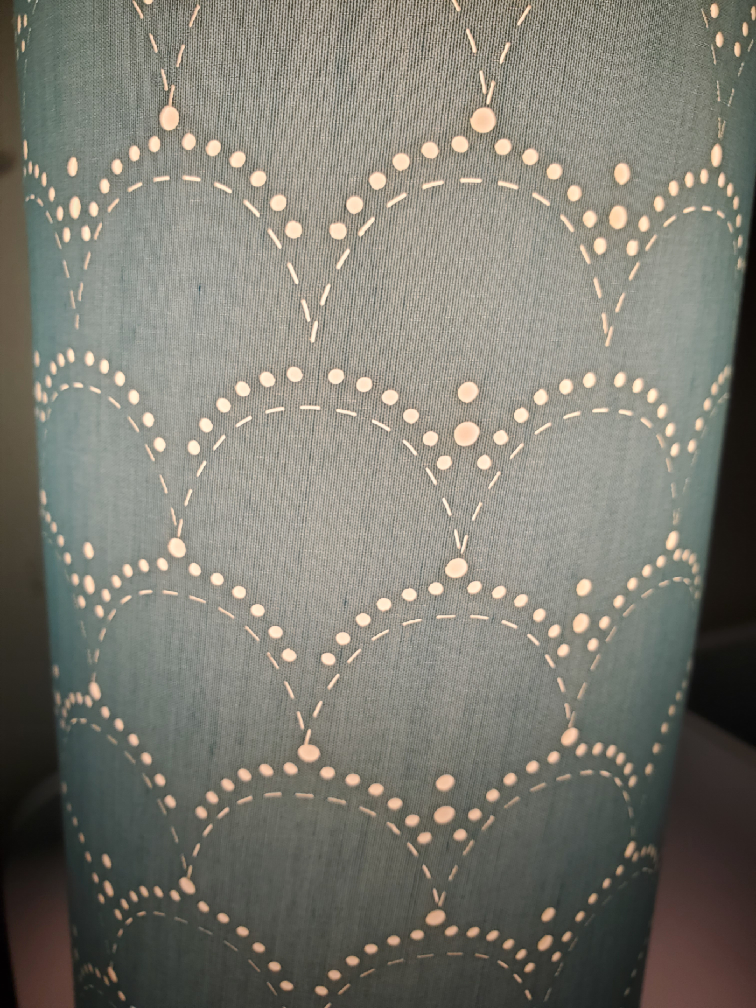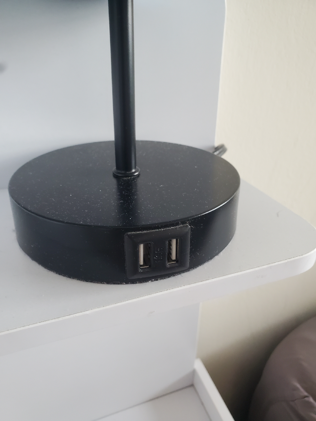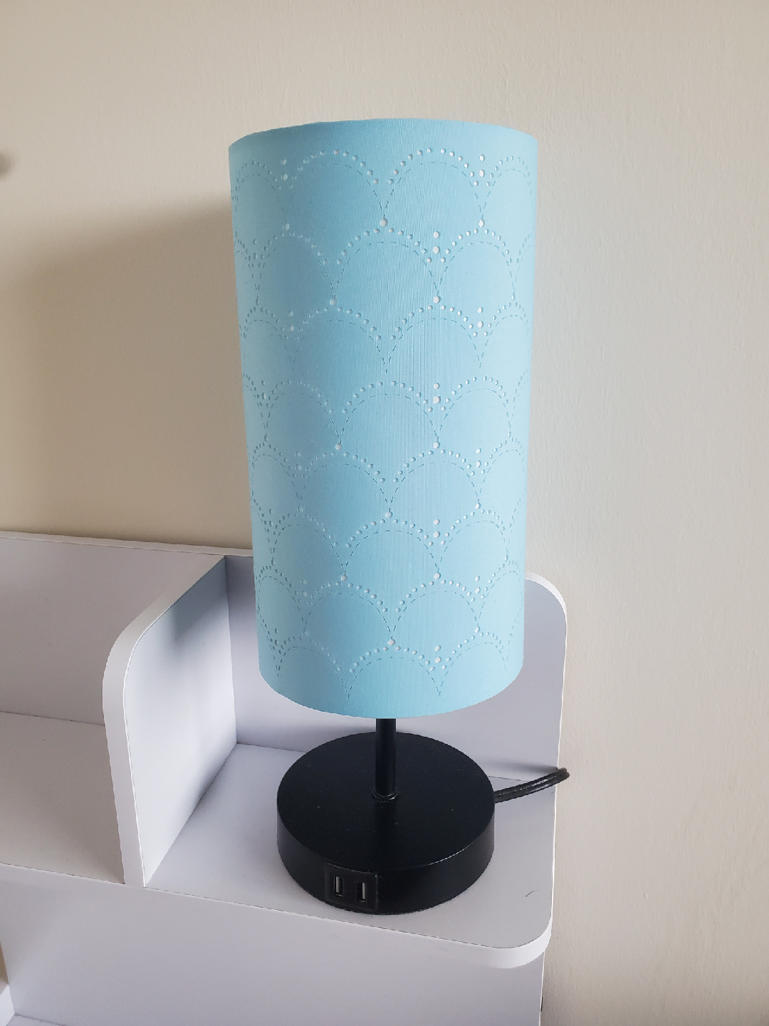 Table lamps with 2 USB ports, light blue shade with scalloped detail, touch-on/off, three brightness settings.