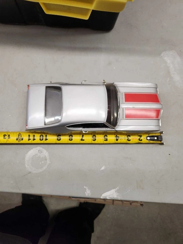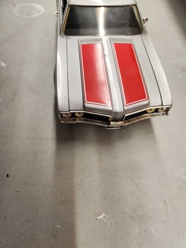 Selling a collectible 442 Oldsmobile diecast car in a detailed silver and red finish. This model captures the iconic look of the classic muscle car with a meticulous design, perfect for collectors or enthusiasts. It has been displayed on a shelf and is ready for a new home. If the ad is still up, this beauty is available. Cash accepted.