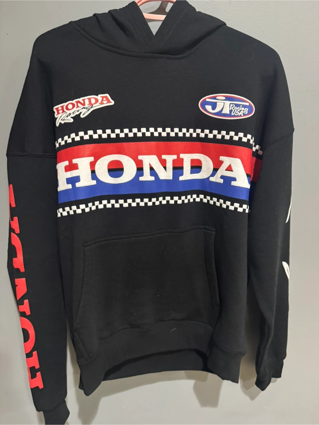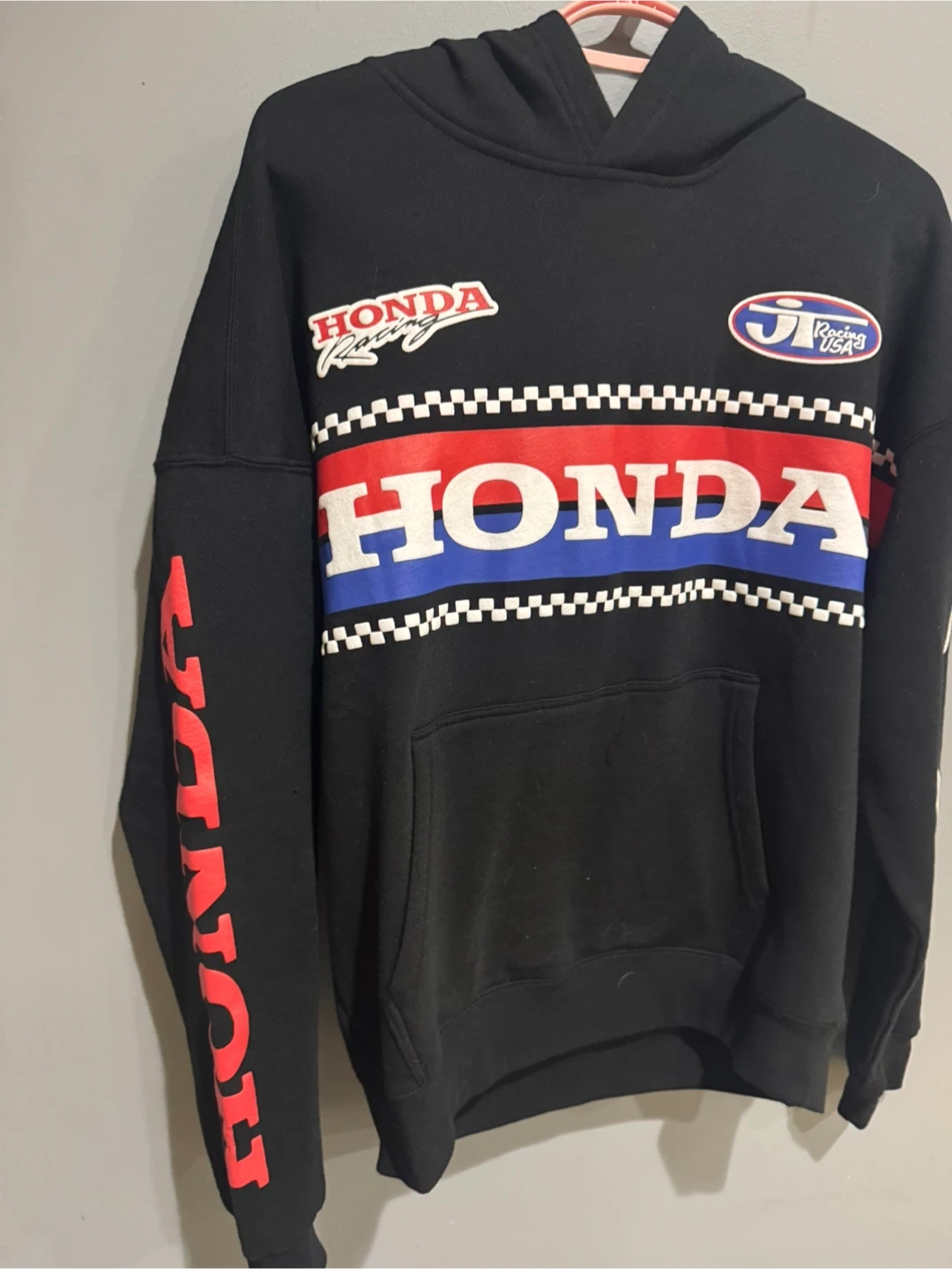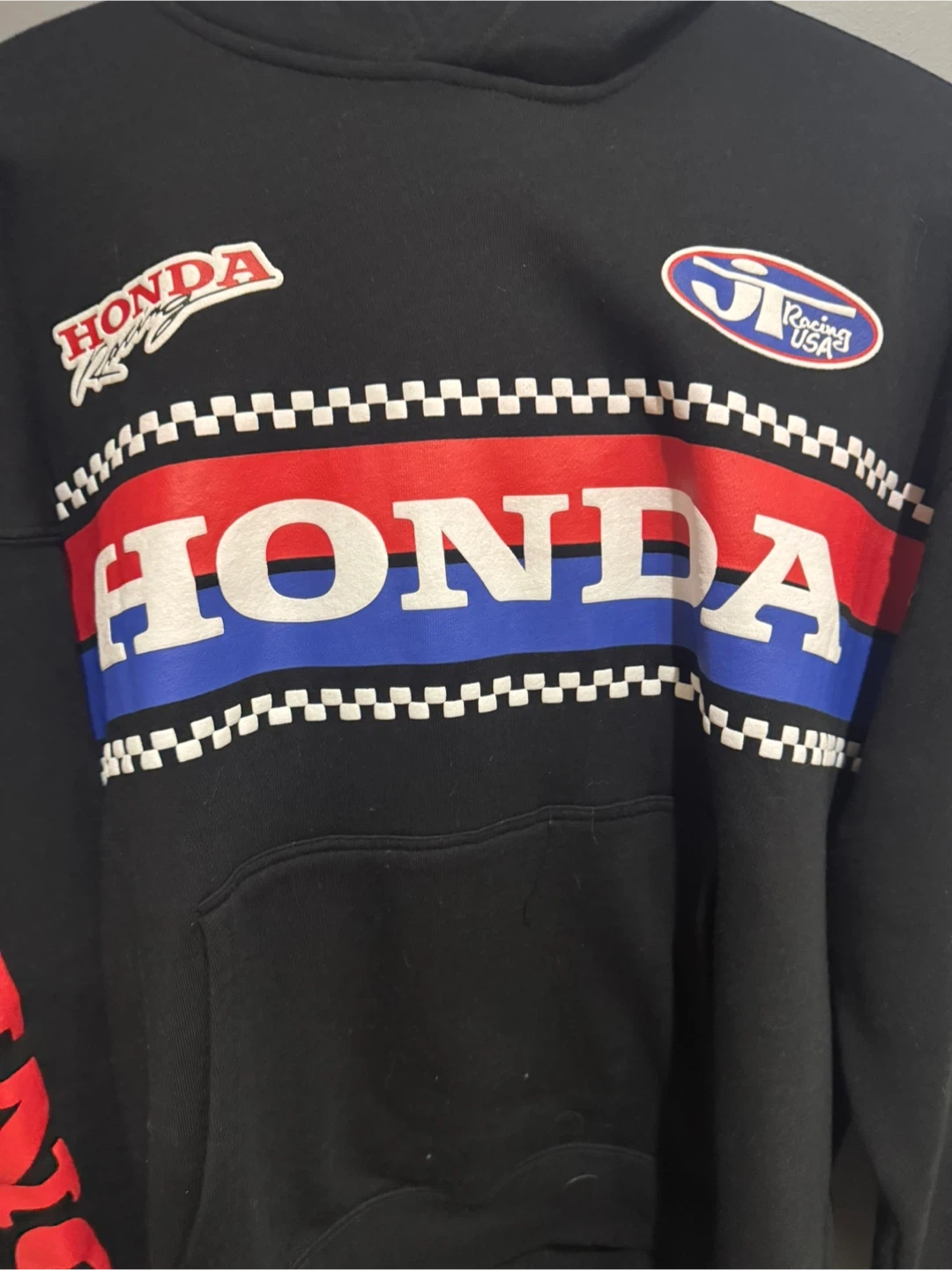 Official Honda Racing hoodie with bold Honda logo across the front and racing graphics on the sleeves. Licensed Honda merchandise produced by JT Racing USA.
