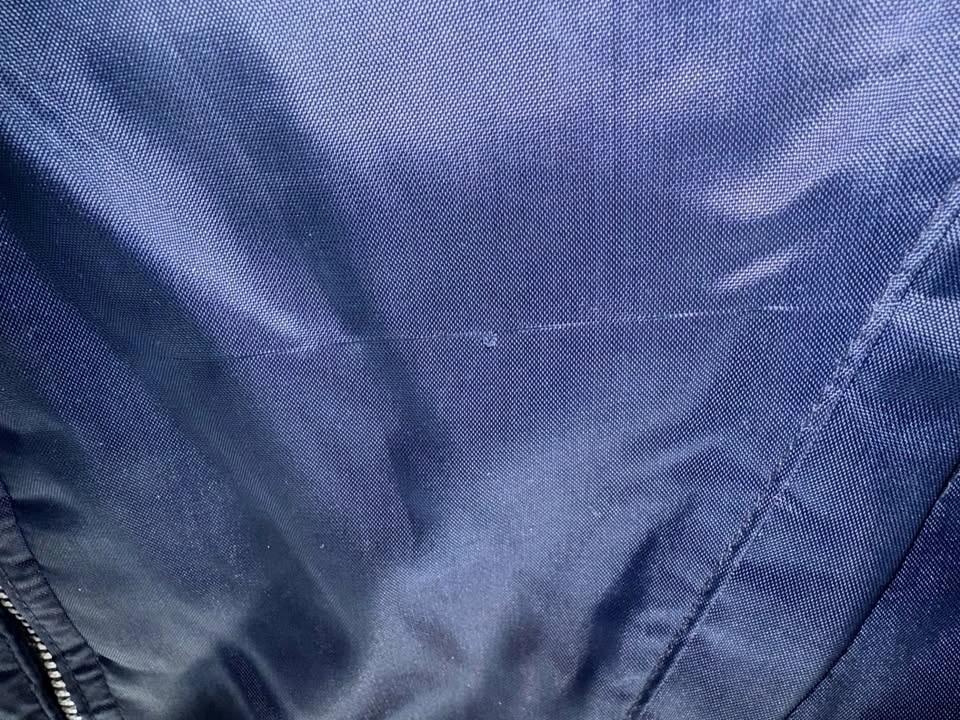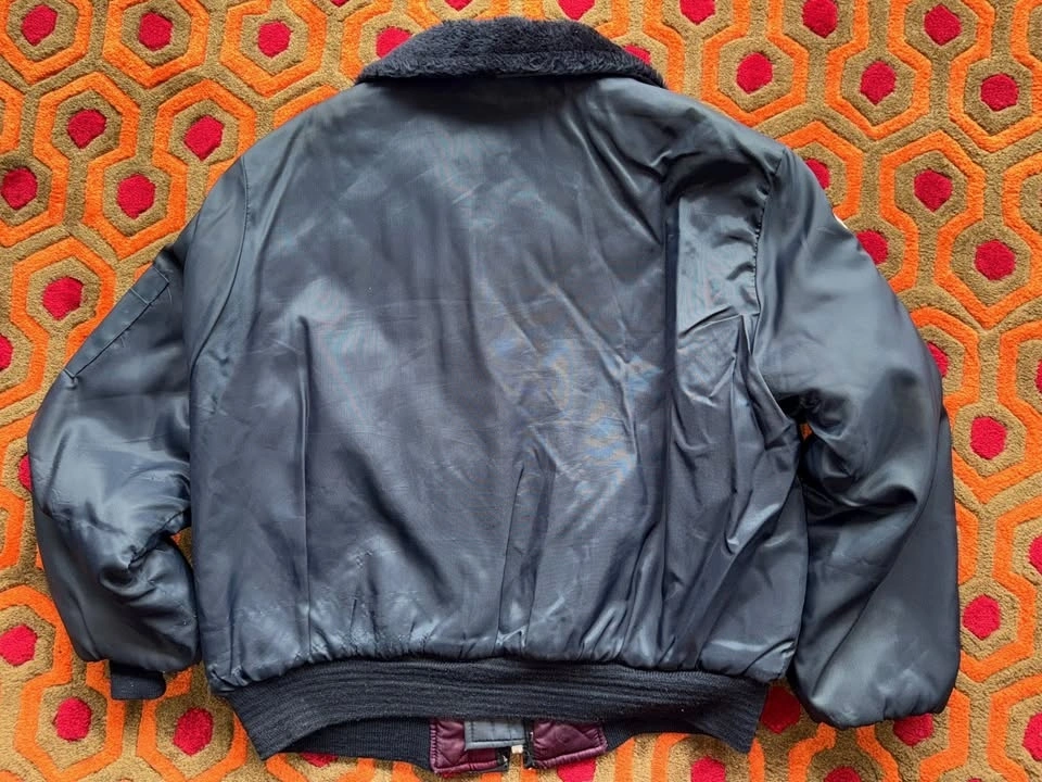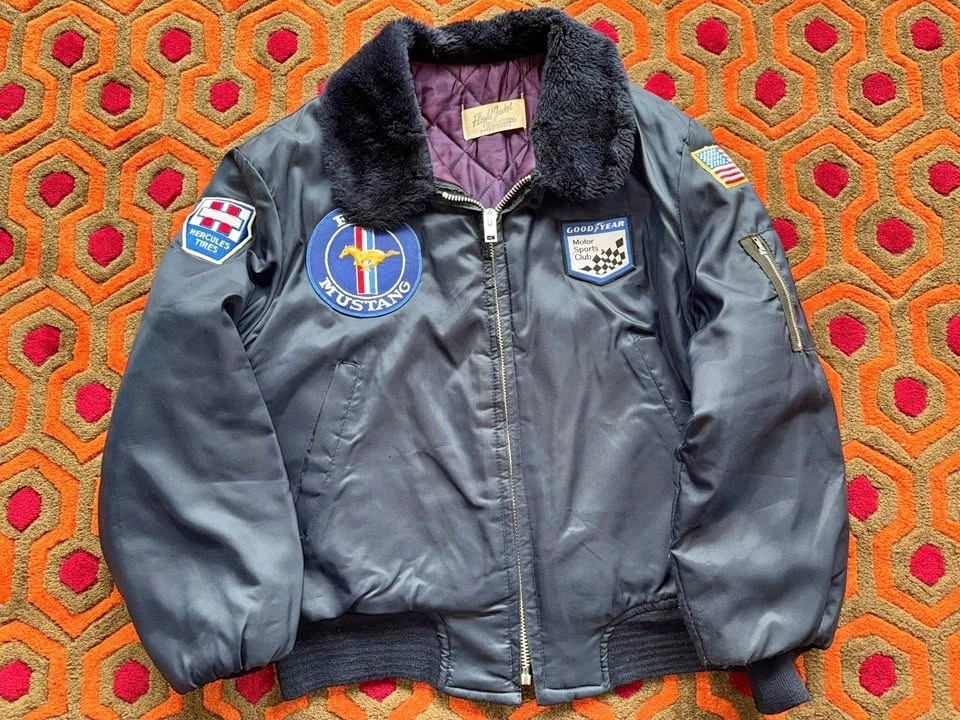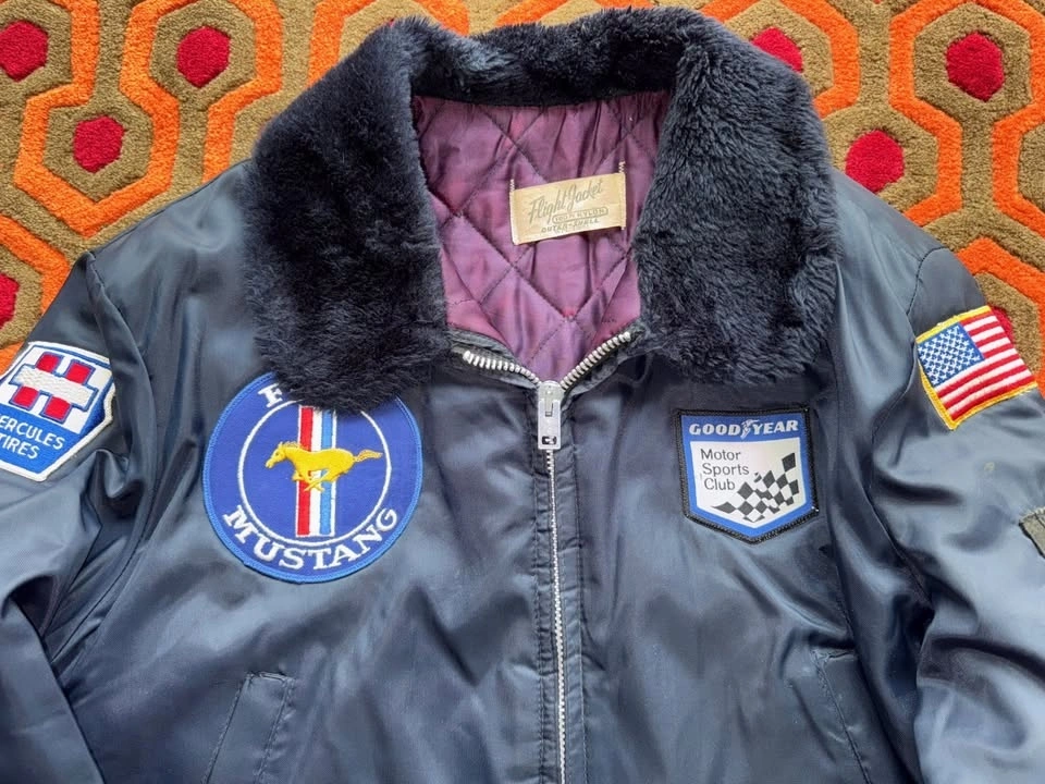 Vintage Flight Jacket, fits Men's Small to Medium. Measures about 25" pit to pit. Dark blue outside with purple lining. Features patches from USA flag, Good Year Motor Sports Club, Ford Mustang, and Hercules Tires. This is a vintage item and shows signs of wear, including runs in the nylon and wear on the sleeve cuffs. Pick up at Yonge & Sheppard.