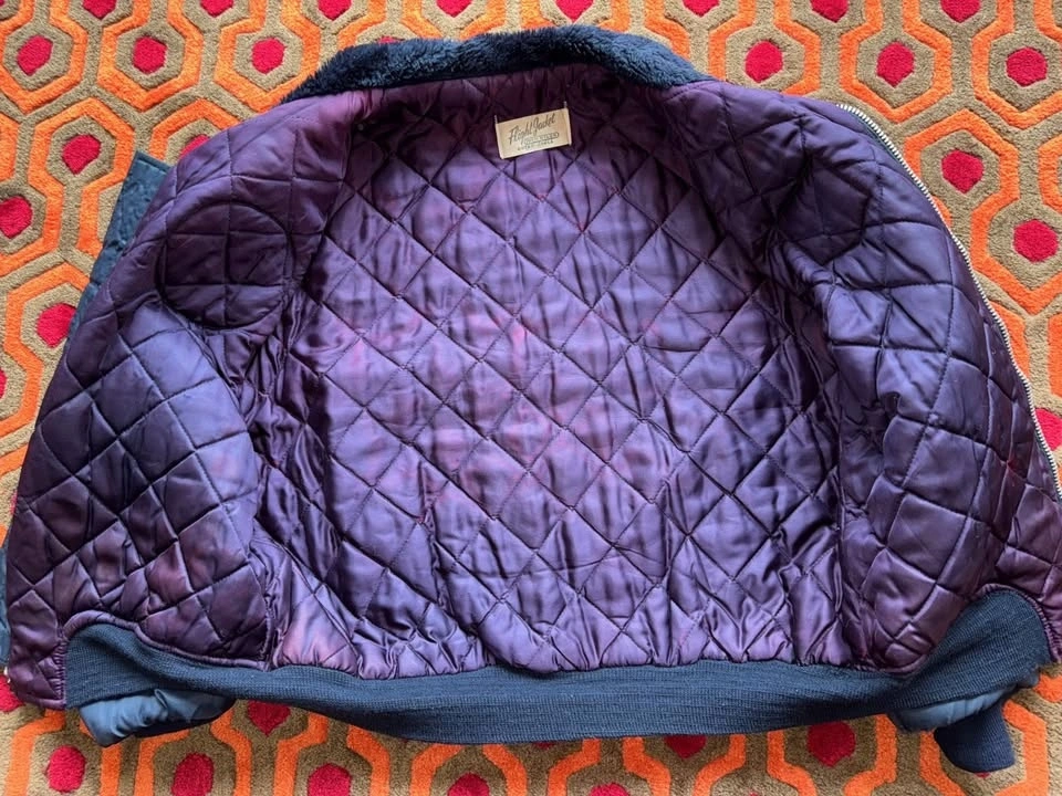 Vintage Flight Jacket, fits Men's Small to Medium. Measures about 25" pit to pit. Dark blue outside with purple lining. Features patches from USA flag, Good Year Motor Sports Club, Ford Mustang, and Hercules Tires. This is a vintage item and shows signs of wear, including runs in the nylon and wear on the sleeve cuffs. Pick up at Yonge & Sheppard.