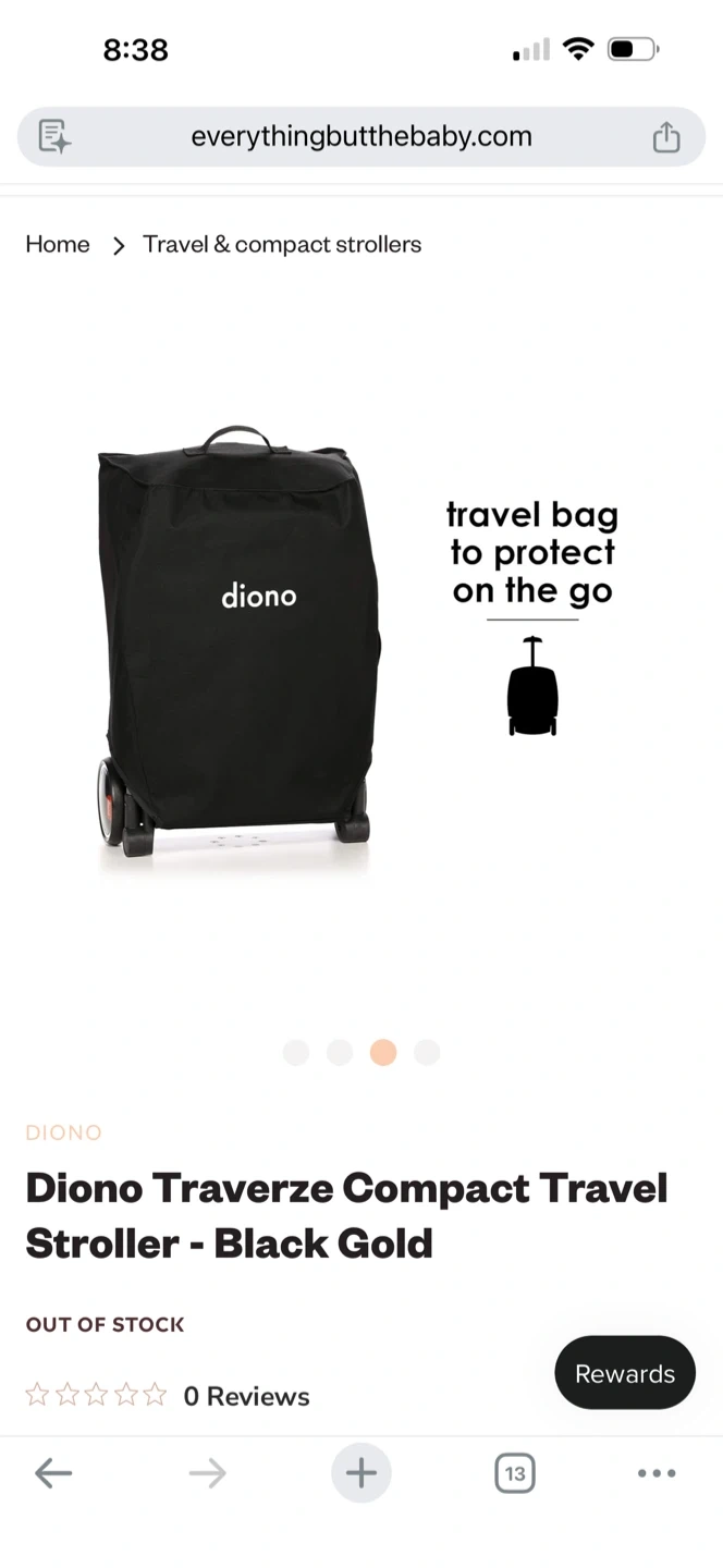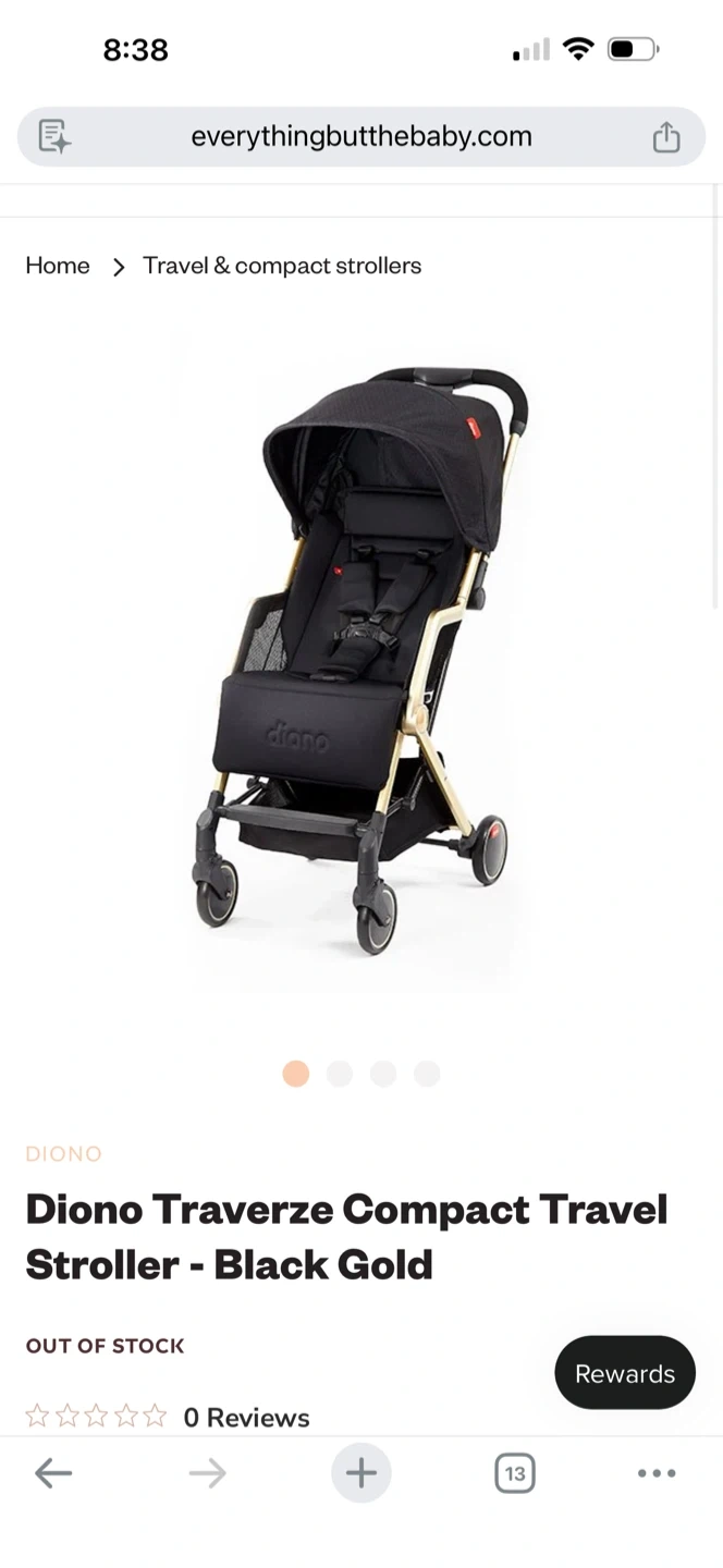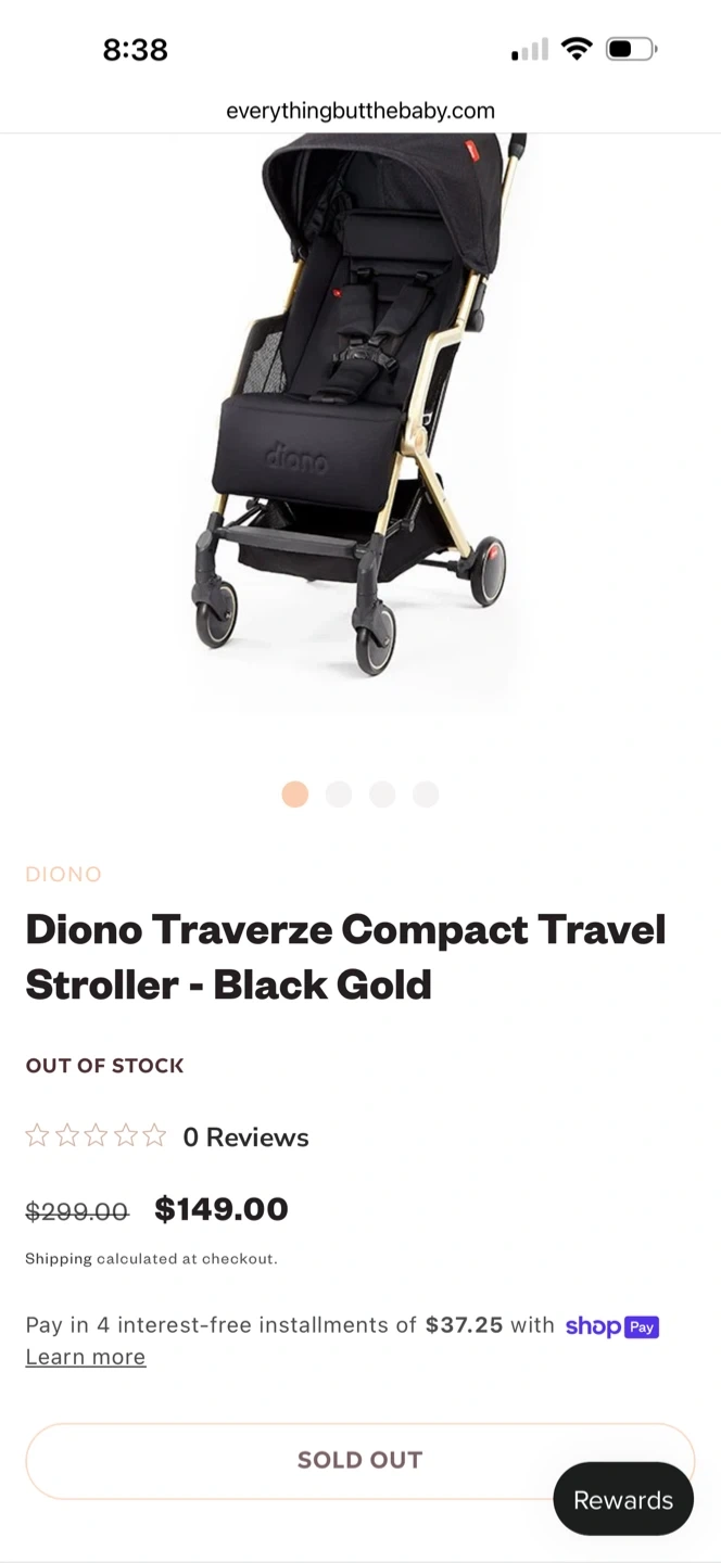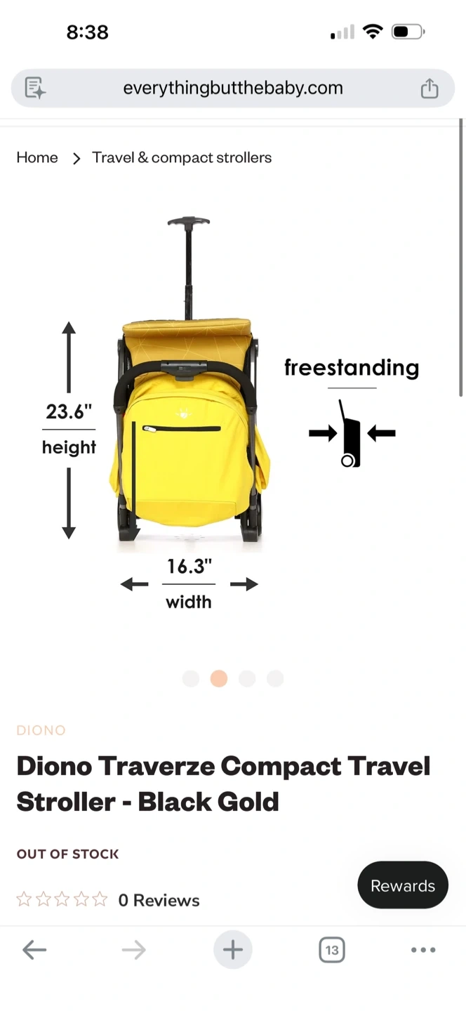 This Diono Traverze is a compact travel stroller in Black Gold. It's freestanding and measures 23.6" in height and 16.3" in width. Includes a travel bag for protection.
