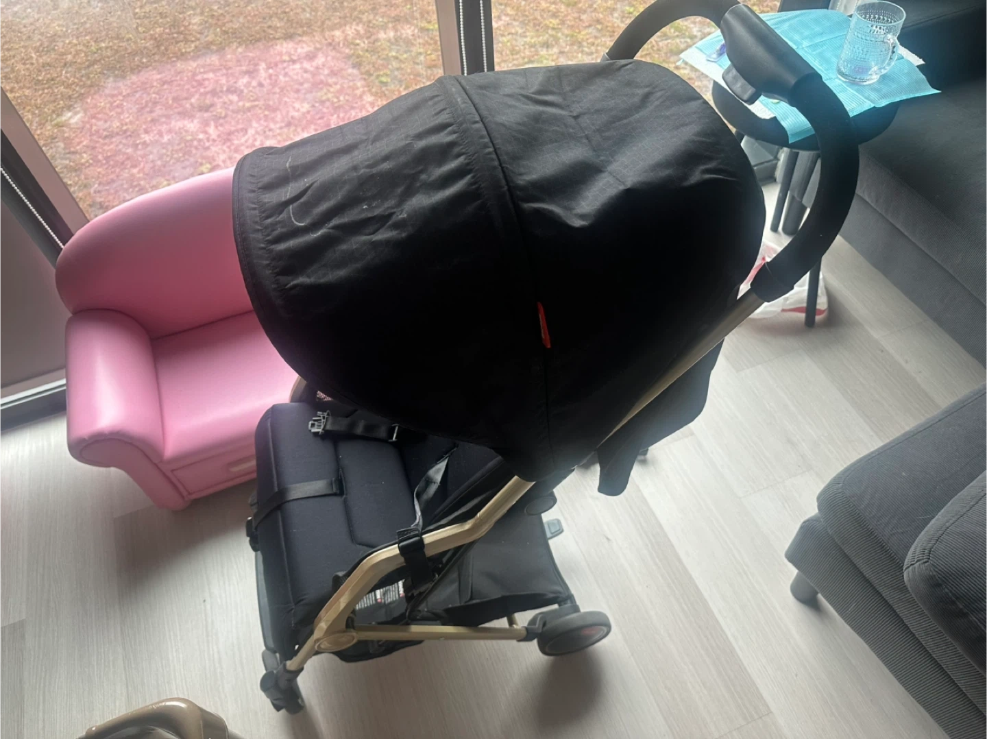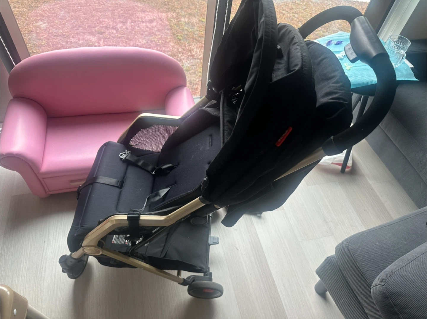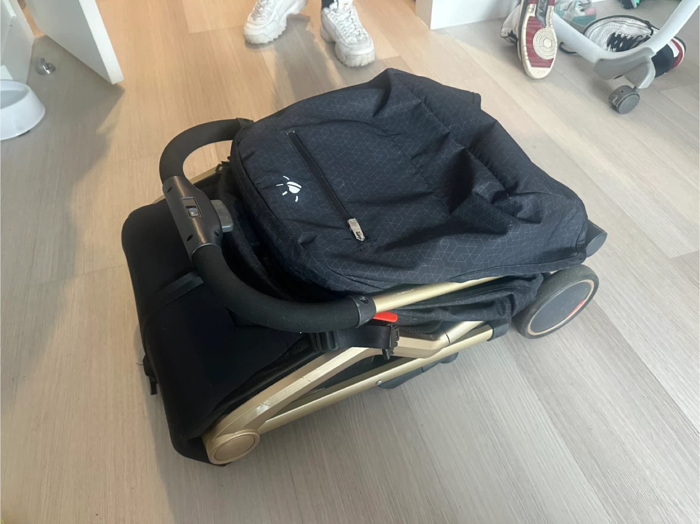 This Diono Traverze is a compact travel stroller in Black Gold. It's freestanding and measures 23.6" in height and 16.3" in width. Includes a travel bag for protection.