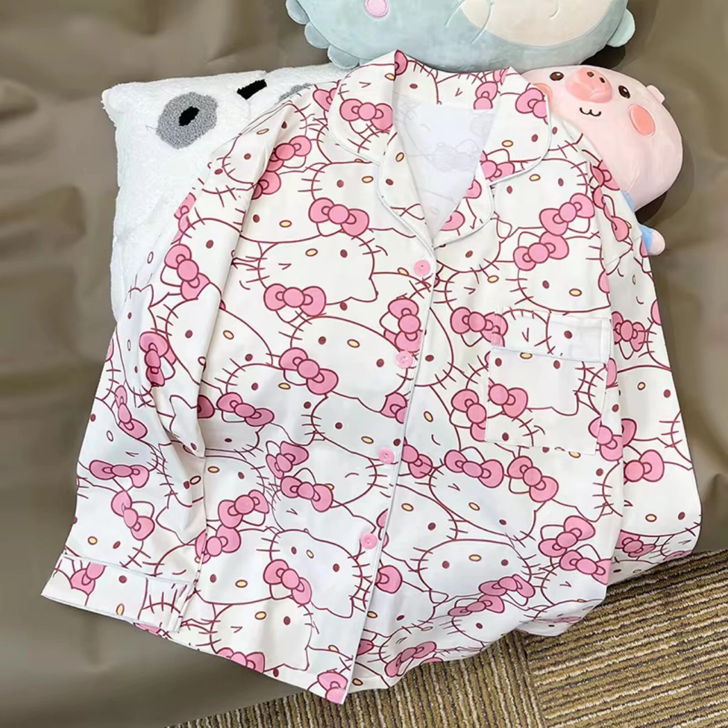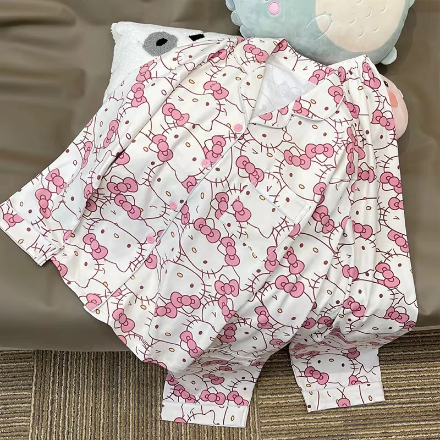 Never used! Adorable Hello Kitty pajama set. Long-sleeved top and long pants. Button-up top. Cream coloured background with pink Hello Kitty print. Cute and comfortable. Cotton! I also have a medium, same pair.
