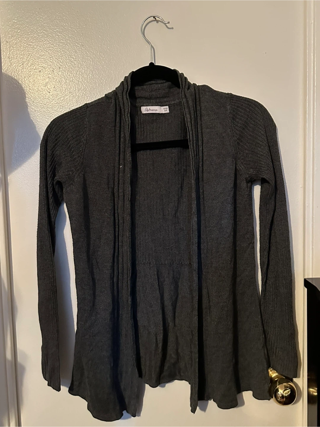 Selling a gently used Reitmans Petites cardigan in size small. It's a lovely gray colour and has a comfortable, relaxed fit. Perfect for layering on cooler days!