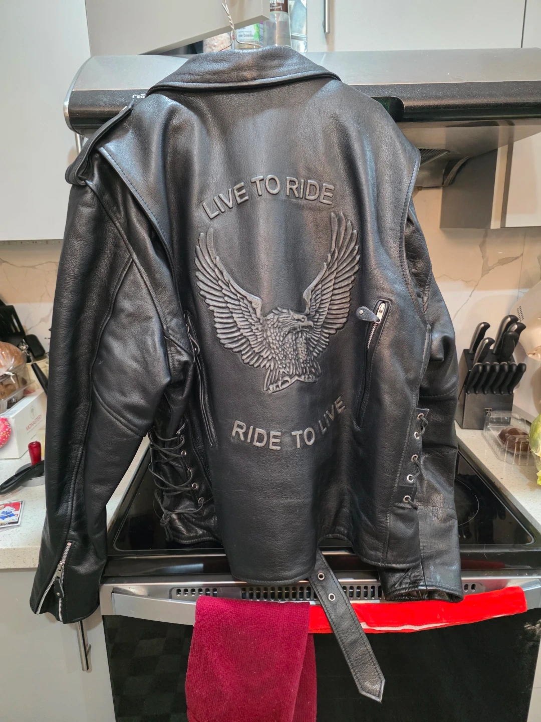 This black leather motorcycle jacket features a classic biker style. The back has an embossed eagle design with the text 'LIVE TO RIDE RIDE TO LIVE'. It includes multiple zippered pockets and a belt at the waist. It's made of genuine leather.
