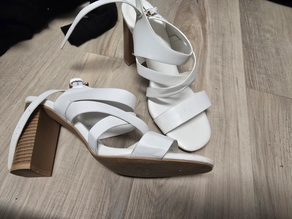 Selling a pair of white strappy heels. They have a block heel and a cute, minimalist design. Perfect for dressing up for a night out or adding a bit of flair to any outfit!