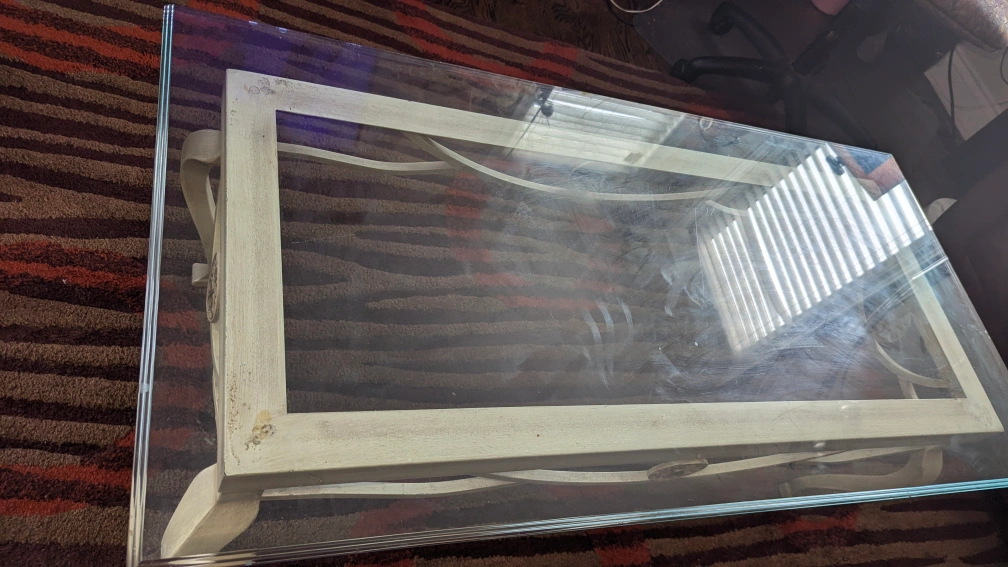 2 Elegant coffee table. Features a large glass top and an ornate, off-white metal frame. Curved legs. Some minor wear visible.