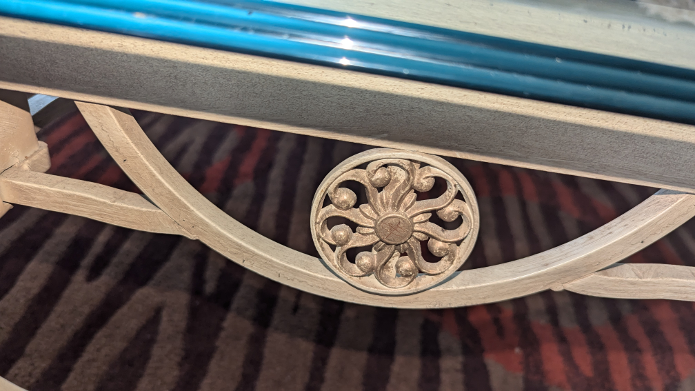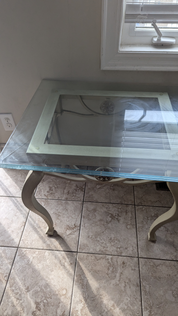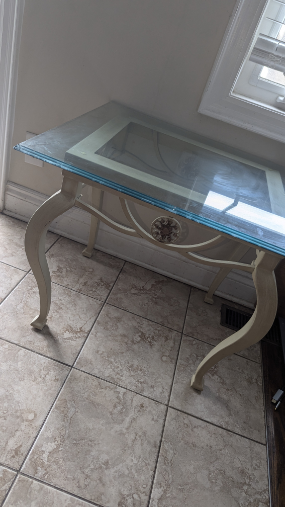 2 Elegant coffee table. Features a large glass top and an ornate, off-white metal frame. Curved legs. Some minor wear visible.