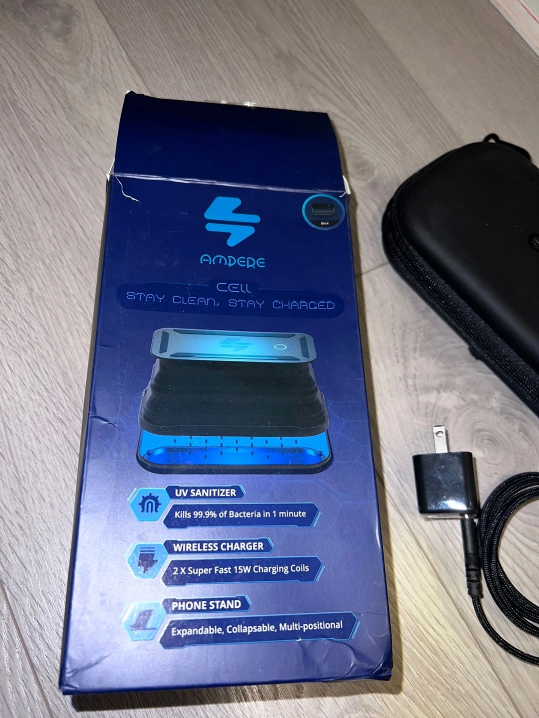 UV sanitizer and wireless charger, includes carrying case and charger. Features: expandable and collapsible, multi-positional phone stand, 2x 15W charging coils.